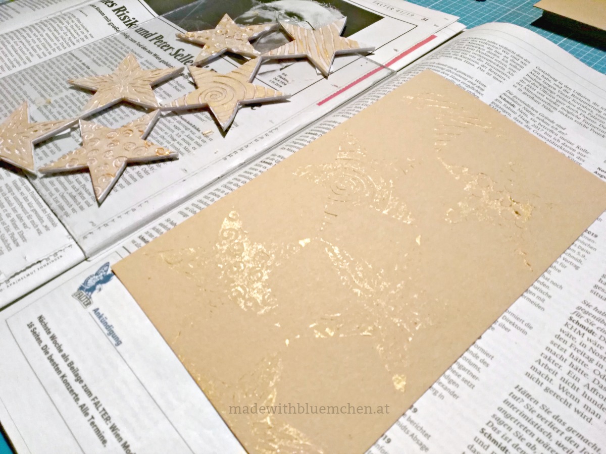 Eigentlich wollte ich goldene Sterne stempeln, das ergab aber leider zu wenig Konstrast für mein Empfinden, auch wenn es im schrägen Licht dezent glänzt. Deshalb bin ich auf dunkelgrüne Farbe umgestiegen. Von der Farbplatte und der Gummirolle hat sich trotzdem noch ein wenig goldiger Glanz auf die Karten übertragen. Für ein wenig zusätzliches „Blingbling“ habe ich alle Sterne mit goldenem Gelschreiber umrandet.