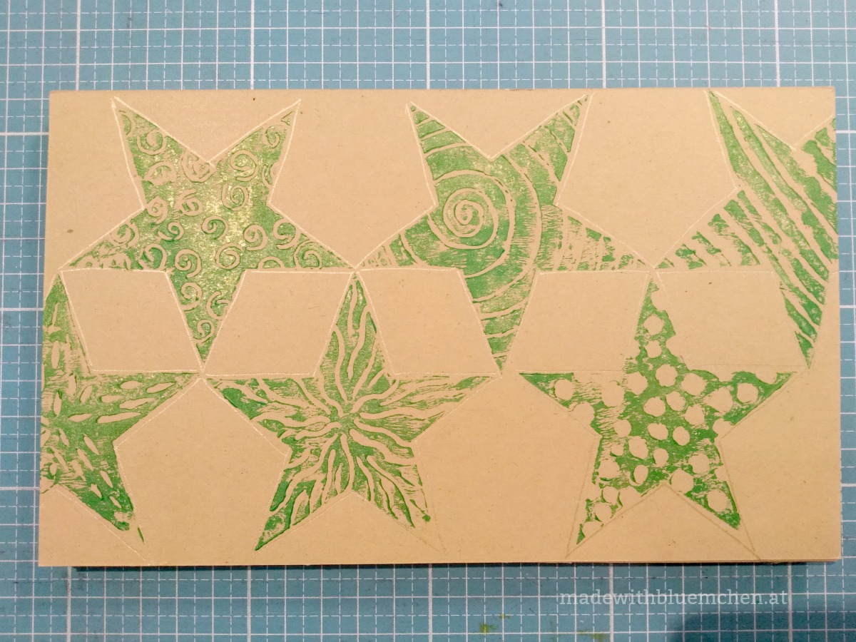 Ursprünglich wollte ich für die Illustration Schneeflocken schnitzen, oder Weihnachtskugeln, war aber mit meinen Entwürfen nicht zufrieden. Dann habe ich mich an die Sternenstempel erinnert, die ich letztes Jahr für einen Tischläufer geschnitzt habe. Damals habe ich eher zufällig verteilt auf Stoff gestempelt. Für die Postkarten habe ich jetzt die sechs verschiedenen Sterne mit Doppelklebeband geordnet auf einer durchsichtigen Acrylplatte fixiert: Der Abdruck hat ziemlich genau auf das vorgegebene Format gepasst.