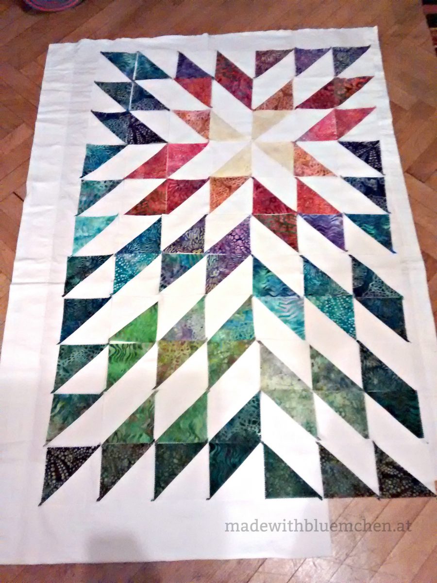 Arbeitszeit: Hab ich wieder mal nicht notiert…. Ähm. Rund drei Stunden Dreiecke nähen und nochmal zwei bis drei quilten, schätze ich.
