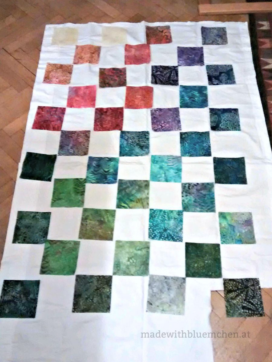Material: ein Charm Pack „Tigerfish“ von Robert Kaufmann, gekauft in München bei Quilt & Textilkunst; ein altes weißes Leintuch; eine alte Fleece-Decke von Ikea
