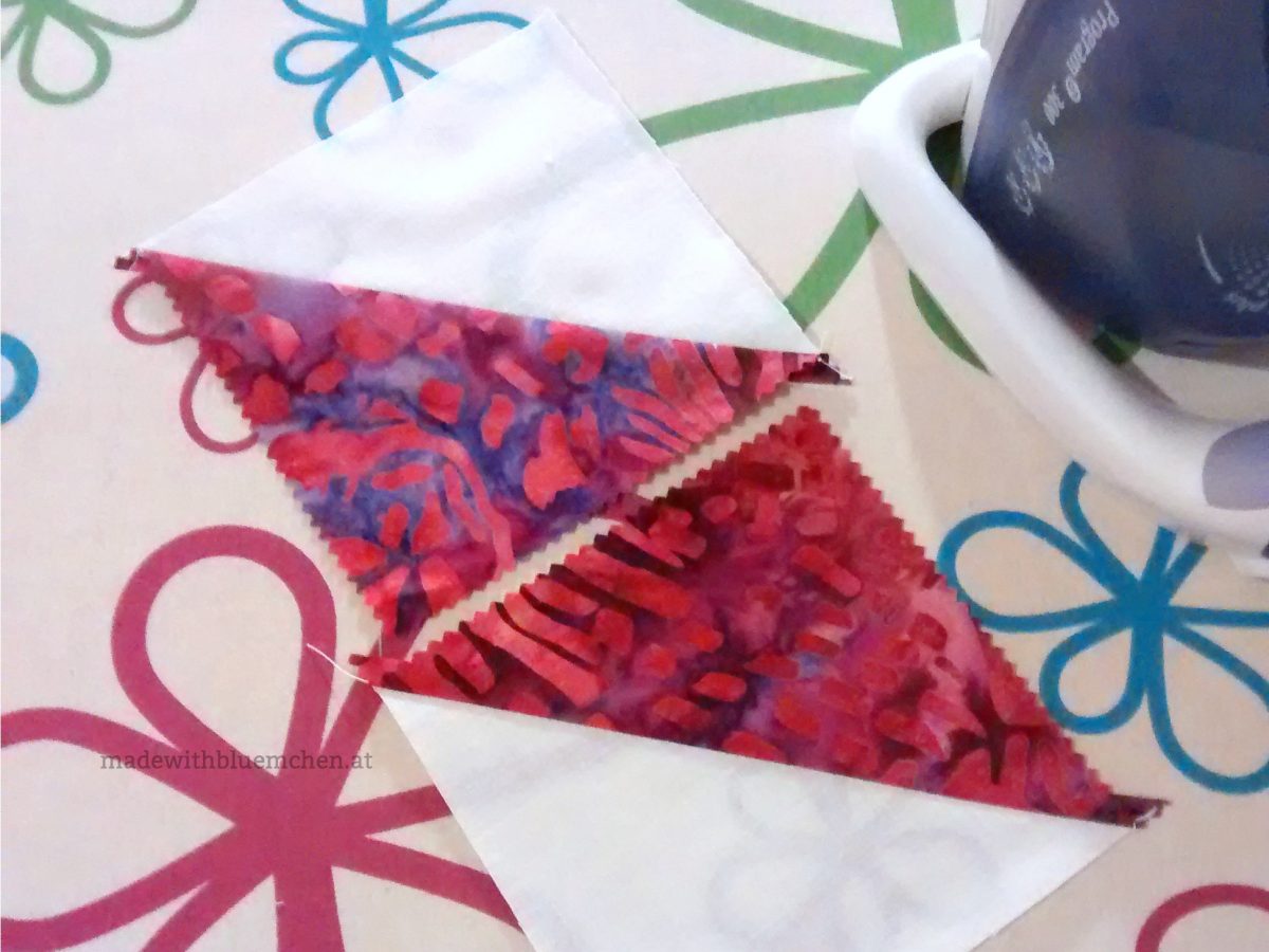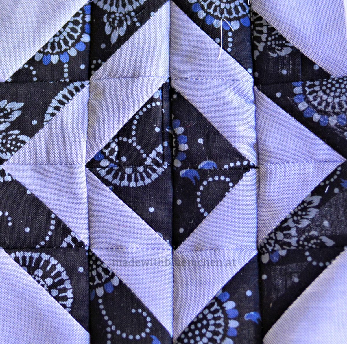 Schnitt/ Anleitung: Die Anordnung der Dreiecke als Stern kommt von Pinterest. Anleitungen für Half Square Triangles gibt es viele, die von Judith September’s Quiltdelight hatte ich mir schon vor längerer Zeit abgespeichert, vor Kurzem hat auch Verena einfach bunt im Rahmen des 6 Köpfe – 12 Blöcke sew along eine Anleitung verfasst.