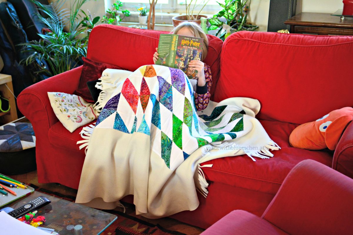 Das Charm Pack habe ich mit einem alten weißen Leintuch kombiniert, und da das alles miteinander noch zu klein war, um die die bald achtjährige Tochter zu bedecken, haben wir beschlossen dass ich das Top auf eine alte weiße Fleecedecke nähen soll. Habe ich auch gemacht. Die Tochter liebt die Decke und hat sie ständig in Verwendung!