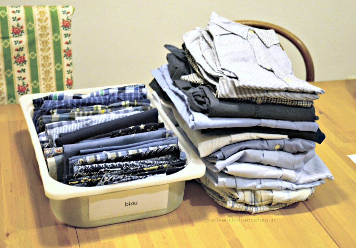 Seit einiger Zeit schon sammle ich alte Hemden meines Mannes. Diese kommen jetzt gemeinsam mit dunkelblauen Kontraststoffen aus dem Stoffpaket, das ich von Kirstin Augusthimmel bekommen habe, zum Einsatz. Damit die Decke ein bisschen größer wird, werde ich von jedem Block zwei Stück machen. (Der zweite Rolling Stone ist schon zugeschnitten.) Sehr wahrscheinlich komme ich mit meinen Stoffreserven nicht zurande und werde noch dunkelblaue Stoffe nachkaufen müssen.
