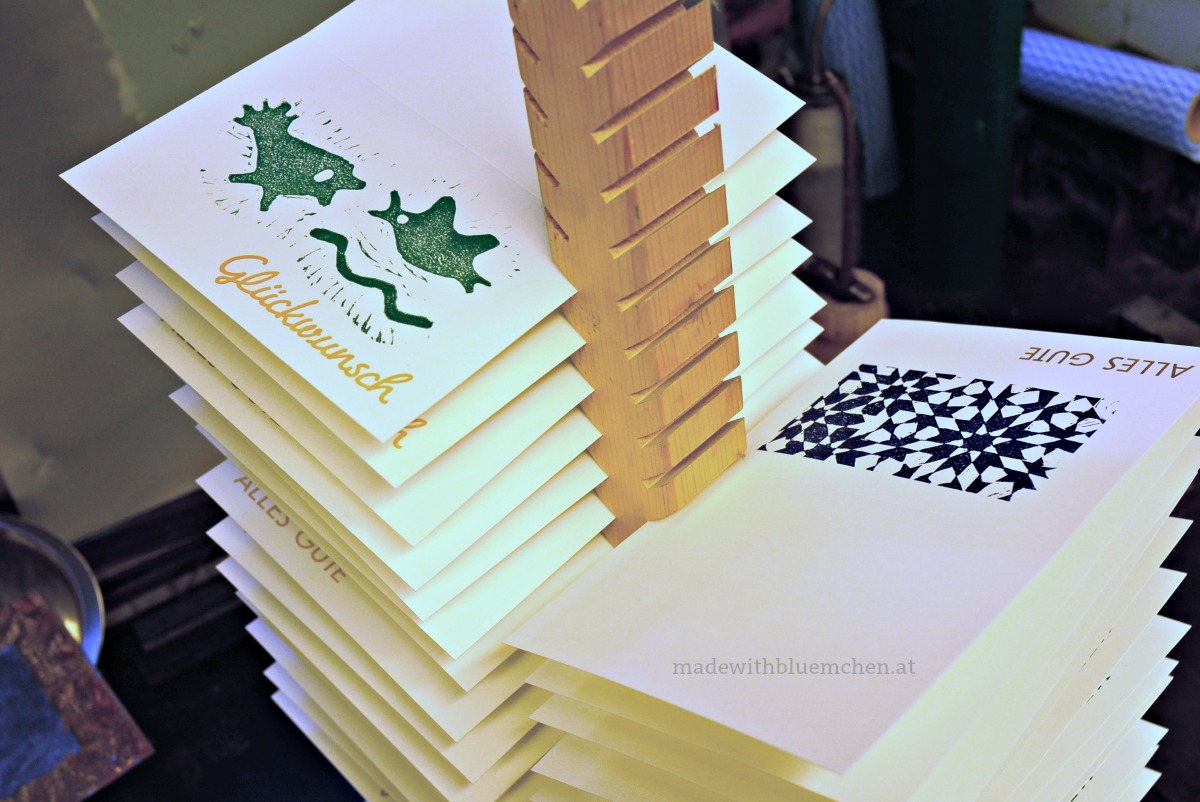 Anschließend muss die Druckerfarbe ein paar Stunden trocknen. Dafür haben wir die Glückwunschkarten auf eigens angefertigten Ständern einsortiert und erst ein paar Tage später abgeholt.
