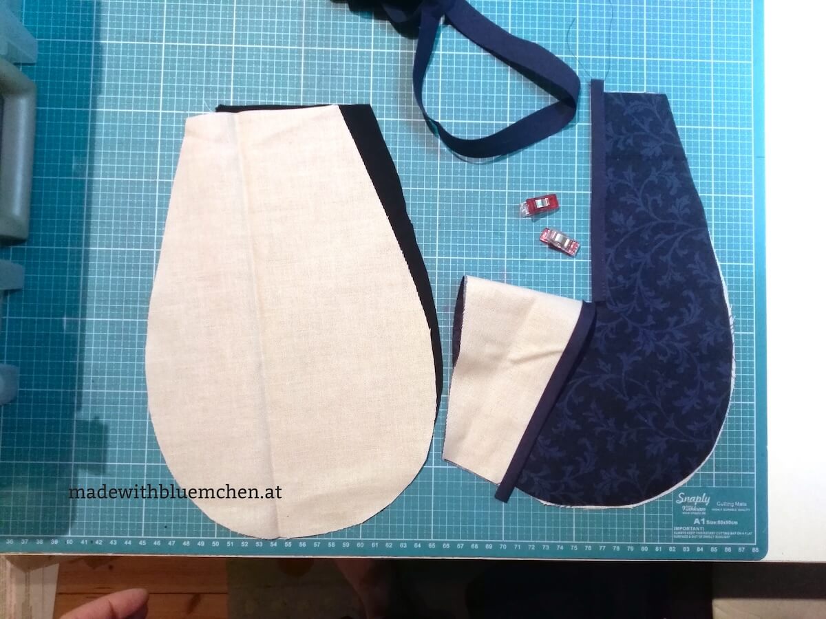 Um die Tasche zu verstärken, habe ich zwei Teile eines feinen Patchworkstoffes als Außenseite zugeschnitten, und zwei weitere als Futterteile, um die Tasche stabiler zu machen. Dazu 100 cm Zentimeter von einem 2 cm breiten Schrägband zur Versäuberung des gerundeten äußeren Randes und des Schlitzes, und als Bindeband meinen Bauchumfang plus ca. 1 Meter.