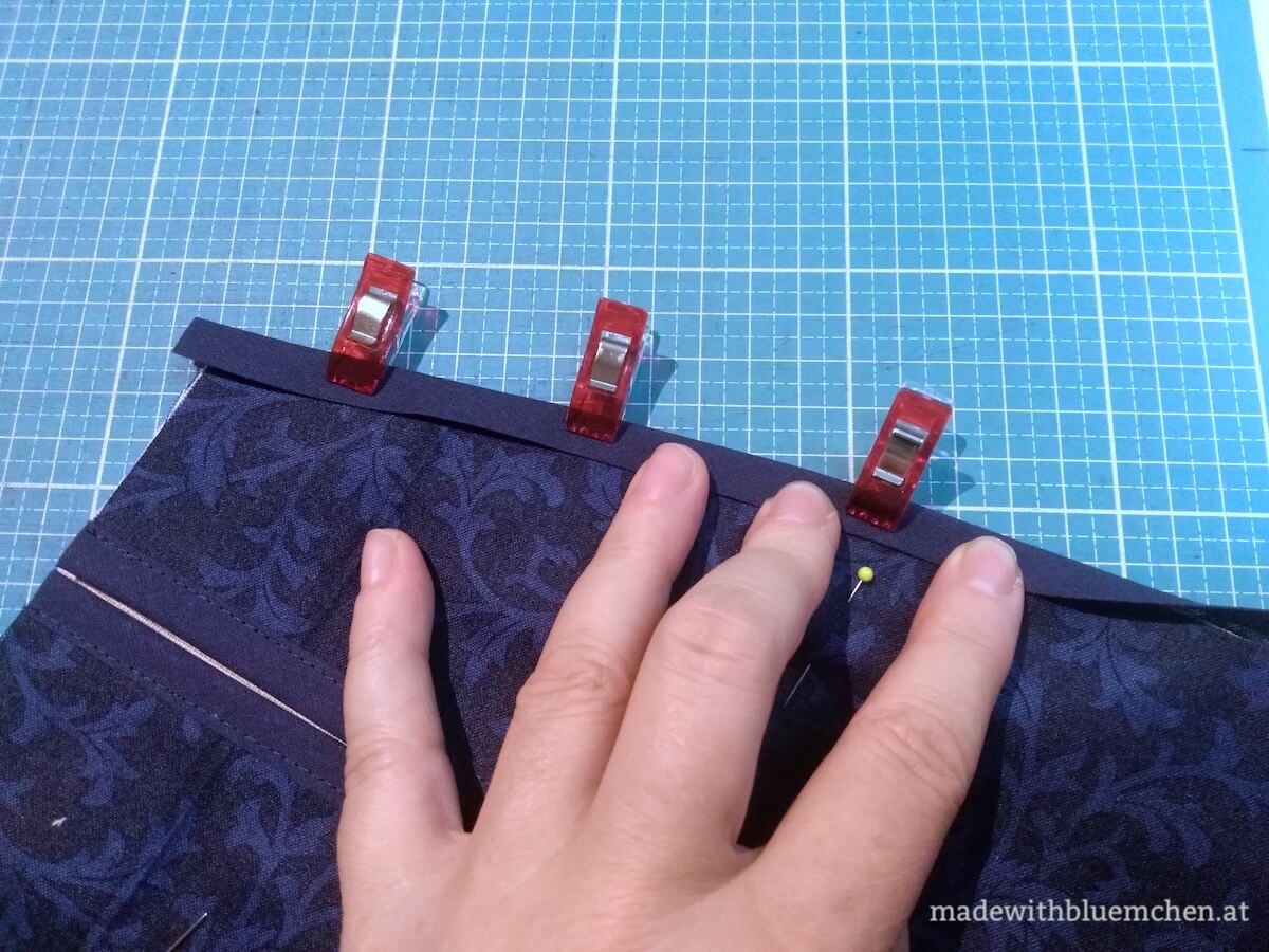 Außerdem ist so ein Umbinde-Beutel praktischerweise mit vielen Kleidungsstücken zu kombinieren, und ich erspare mir weitere Taschen-Einnäh-Aktionen. Ich trage diesen Beutel auch zu Röcken und sommerlichen Blusenkleidern, die ich nicht selbst genäht habe, über Beinkleidern wie Leggings, bei denen Taschen eher schwierig einzubauen wären, und über Jogginghosen, bei denen mir die ganze Zeit das Handy aus den Taschen rutscht.