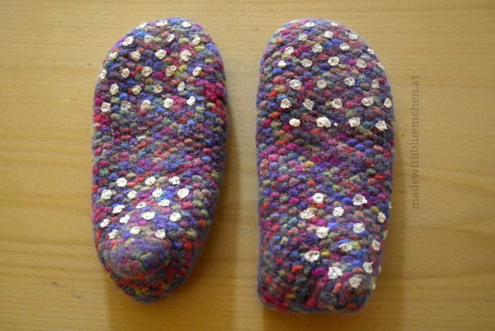 Ich habe auch nach der Anleitung für mich Hausschuhe gemacht. Fotos sogar mal auf meinem Blog gezeigt vor sehr langer Zeit. Nachdem ich sehr wenig Wolle hatte, habe ich keine Filzprobe gemacht und es zum Glück nicht bereut. Der guten Anleitung sei Dank!