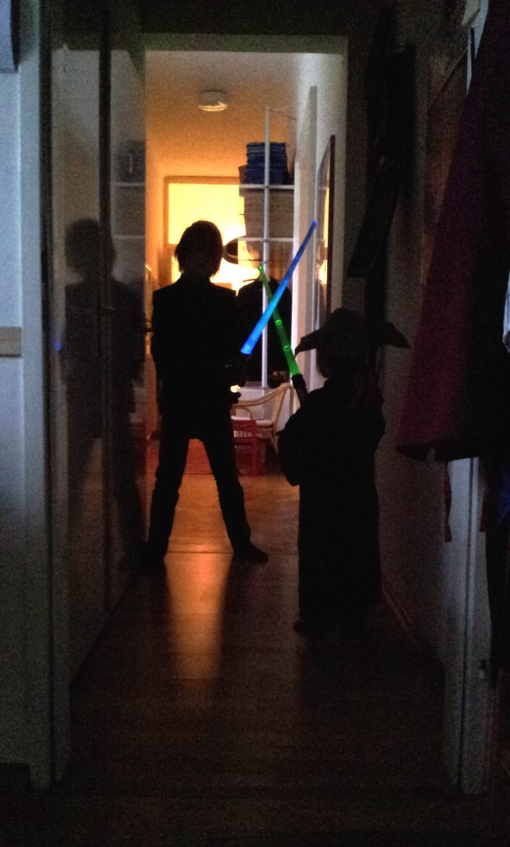 Das war eine schöne Zeit: Die Tochter wollte eine zeitlang nur grüne Sachen haben (nicht rosa), mit der Begründung: „Weil der Yoda hat ein grünes Lichtschwert!“ Das Schwert aufzutreiben war dann allerdings nicht ganz einfach, der Not-Kauf in letzter Minute teuer, und der Konflikt vorhersehbar: Denn das grüne Lichtschwert leuchtet nicht nur heller als das blaue des Bruders, es macht zusätzlich charakteristische Lichtschwert-Geräusche, wenn man es schwingt… Aber Yoda ohne Schwert? Das ging gar nicht.