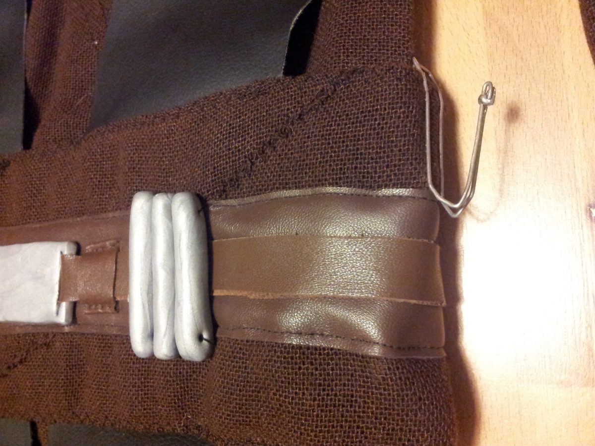 Gürtel: brauner Baumwollstoff, mit Details aus Fimo und Büroklammern besetzt