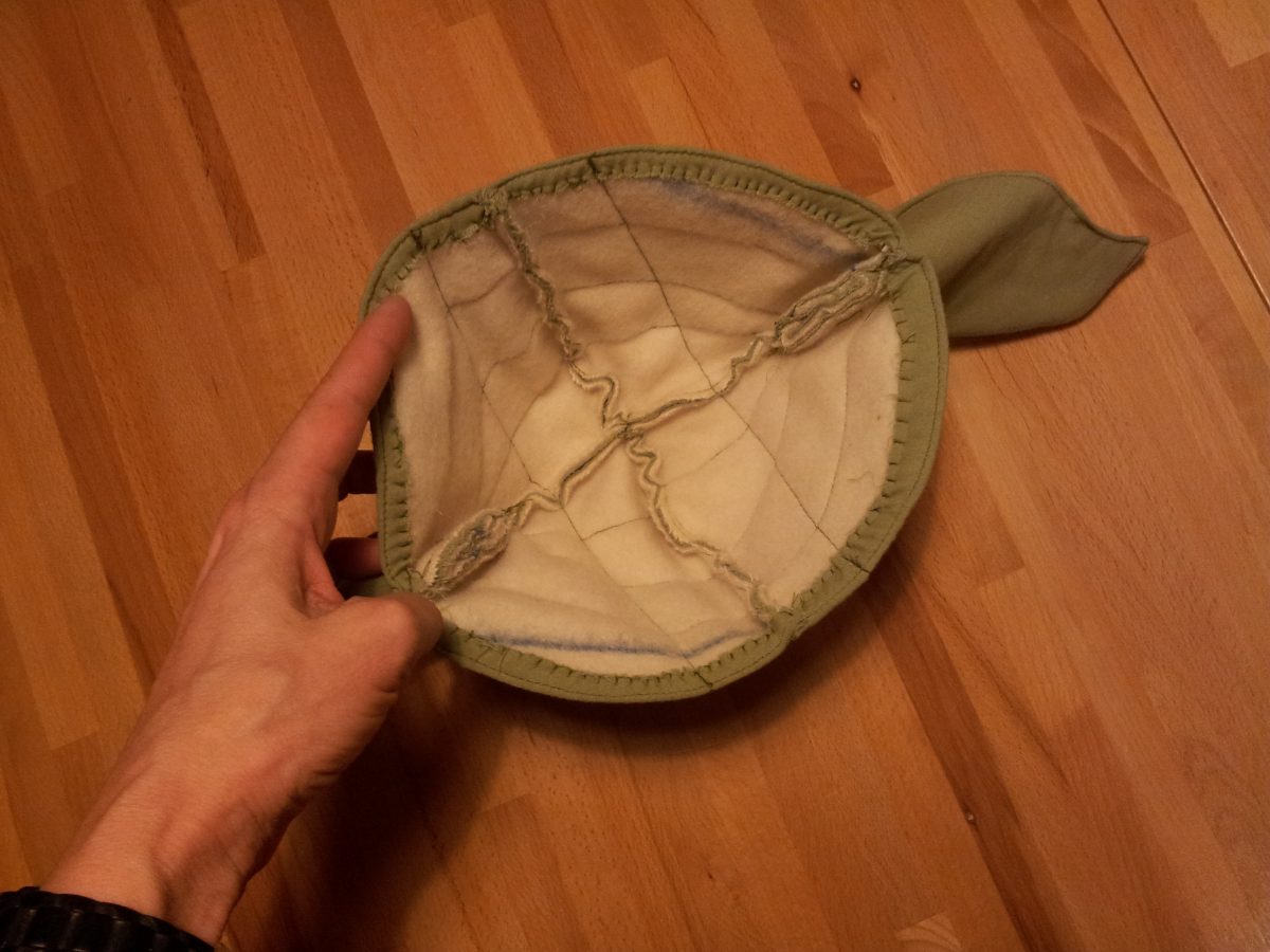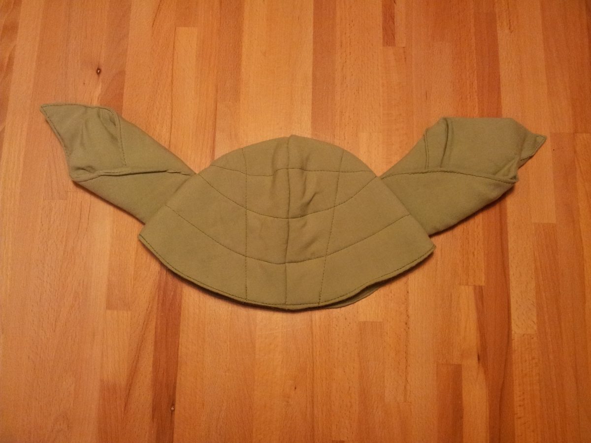 Yoda Mütze: Schnitt selbst entworfen, aus einem Baumwollstoff mit Fleece-Einlage genäht.