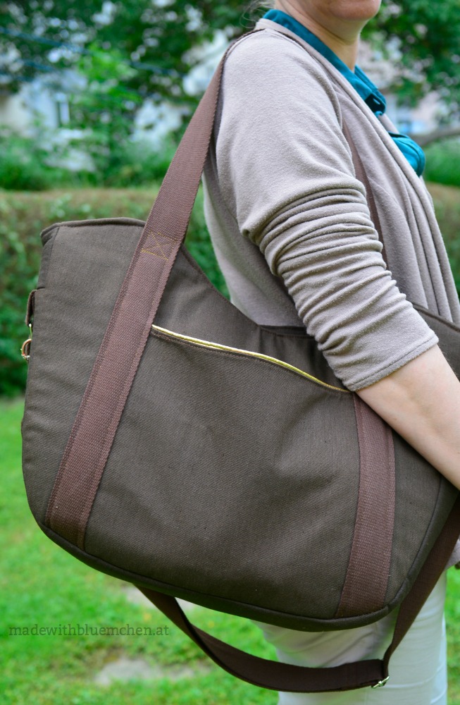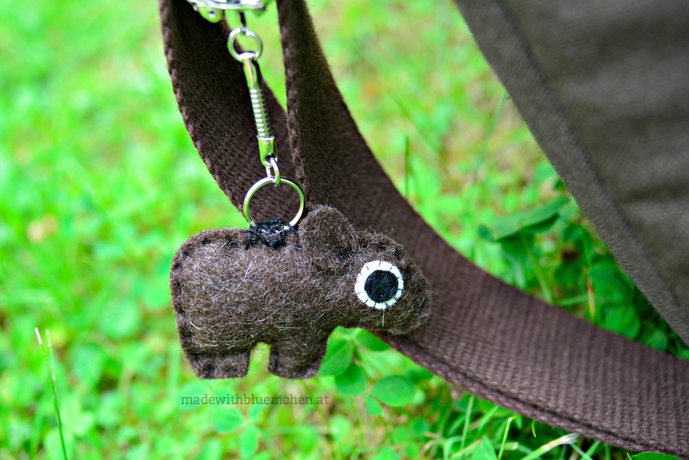 Der orange-golden gewellte Innenstoff, die Akzente mit der goldene Paspel und das handgestichelte Wombat als Anhänger finde ich einfach entzückend! Für die Stabilität der Tasche hat Lisa erstmals Soft and Stable vernäht, soweit ich verstanden habe, und als Trägerlösung hat sie zusätzlich zu den beiden vorgesehenen seitlichen noch einen längeren Riemen quer befestigt, damit ich die Tasche beim Radfahren diagonal über den Rücken tragen kann.