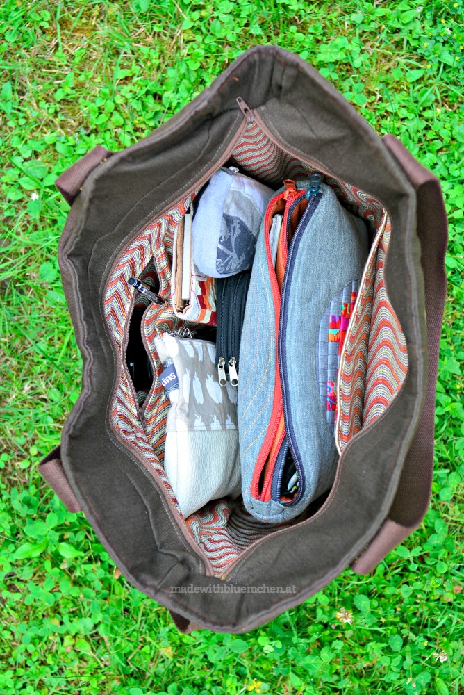 Die October Lady ist super-geräumig und bietet Platz für alles, was ich im Alltag (beruflich) dabei habe: Eine Tasche mit Kleinzeugs (die Double Zip Pouch mit Herz von Ines), ein Federpennal mit Graustufen-Landschaft, ein Beutel mit Kabeln und Steckern (selbst genähtes Geschenk von einer Bekannten), mein Visitenkarten-Handy-Organizer, eine Geldbörse (schnödes Werbegeschenk), die Wasserflasche (fehlt am Bild) und mein Handy in der kleinen Innentasche mit Zipp. Ins abgeteilte große Innenfach (rechts) passt zusätzlich der Laptop – perfekt! Ich habe gleich alle meine Sachen um- und eingeräumt, verwende derzeit nur diese Tasche, und bin mega-glücklich damit.