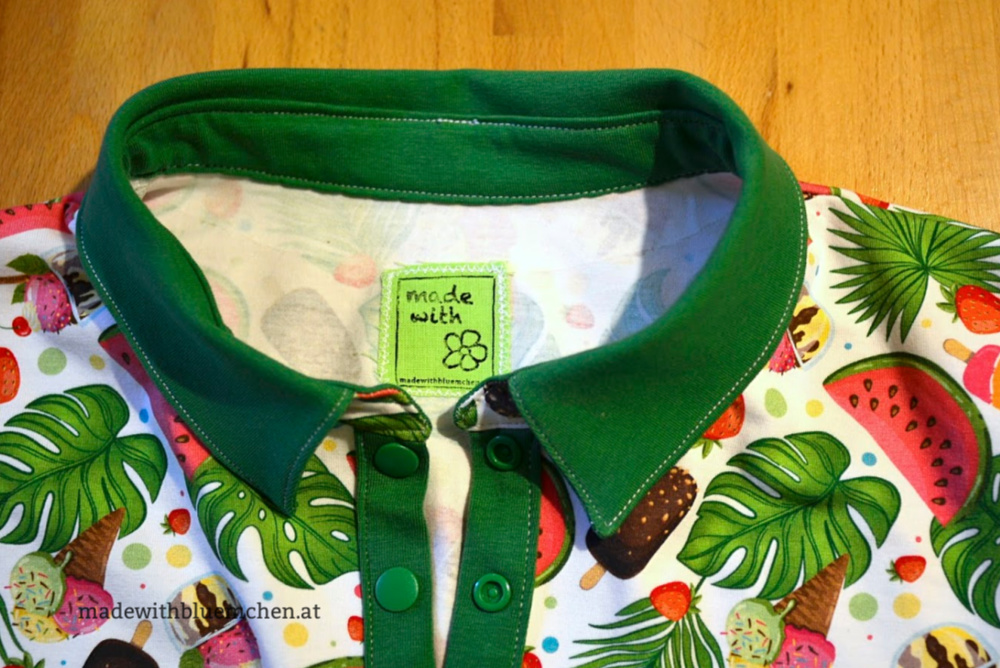 Beim Kragen und beim Kragensteg mag ich es sehr gerne, dass man sich mit den Farben innen und außen (2 Teile für den Kragen, 2 Teile für den Kragensteg) spielen kann. Beim Melonenshirt habe ich alles einheitlich grün zugeschnitten, beim Streifenshirt gelben Kragen und weißen Kragensteg kombiniert. Am Detailbild vom Kragen sieht man leider auch noch den Rand der Verstärkung mit der Vlieseline. Der Melonenjersey ist nur einseitig bedruckt, da fällt die Vlieseline auf der weißen linken Stoffseite nicht auf. Bei diesem Jersey sind die Streifen gewebt, da sieht man es. Beim Tragen fällt es aber zum Glück nicht auf. (Merke: Vlieseline schmäler zuschneiden.)