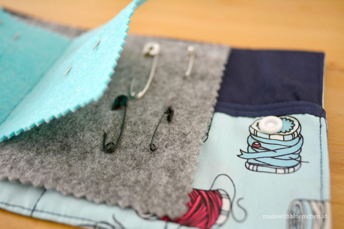 Das Nadelbuch besteht aus poppigem Stoff mit Nähmaschinen-Motiven außen und Garnrollen-Motiven innen. Zusätzlich zu den beiden Filz-Einlagen in der Mitte, die die Nadeln aufnehmen können, hat es innen im „Umschlag“ kleine Einstecktaschen. Da kann ich zum Beispiel die Stickschere gut unterbringen, sehr praktisch!