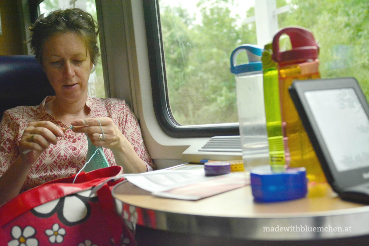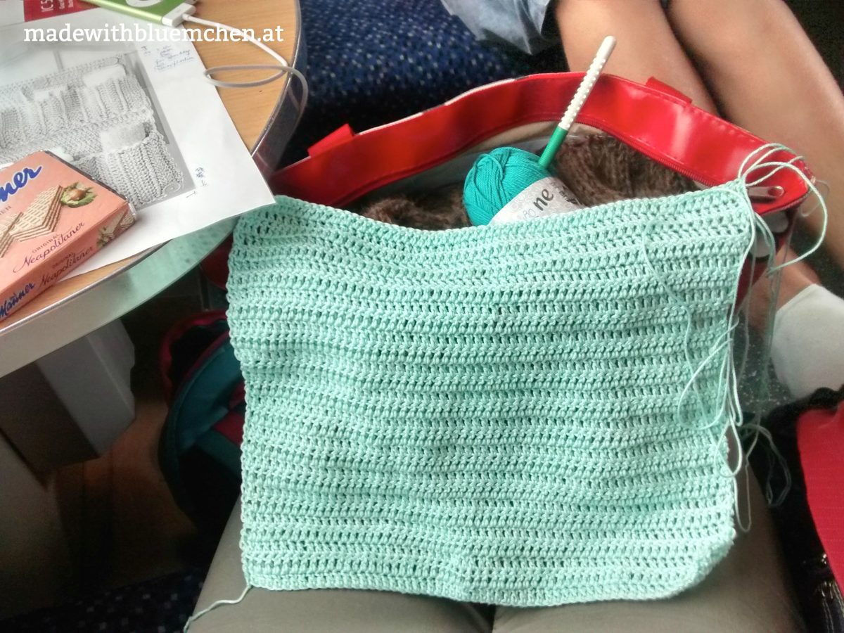 Im Juli war ich mit meinem Wichtelgeschenk aufgrund vielfältiger Verpflichtungen im Leben 1.0 leider ur-spät dran und habe zusätzlich den Aufwand komplett unterschätzt. Mir schwebte ein gehäkeltes Utensilo in sommerlich-frischen Meeres-Farben vor, und zum Glück waren Mint und Türkis unter Sabrinas Lieblingsfarben und ein Hänge-Utensilo ihr willkommen. Aber so richtig mit dem Häkeln beginnen konnte ich erst vor einer Woche, auf einer längeren Zugfahrt mit den Kindern zu den Großeltern.