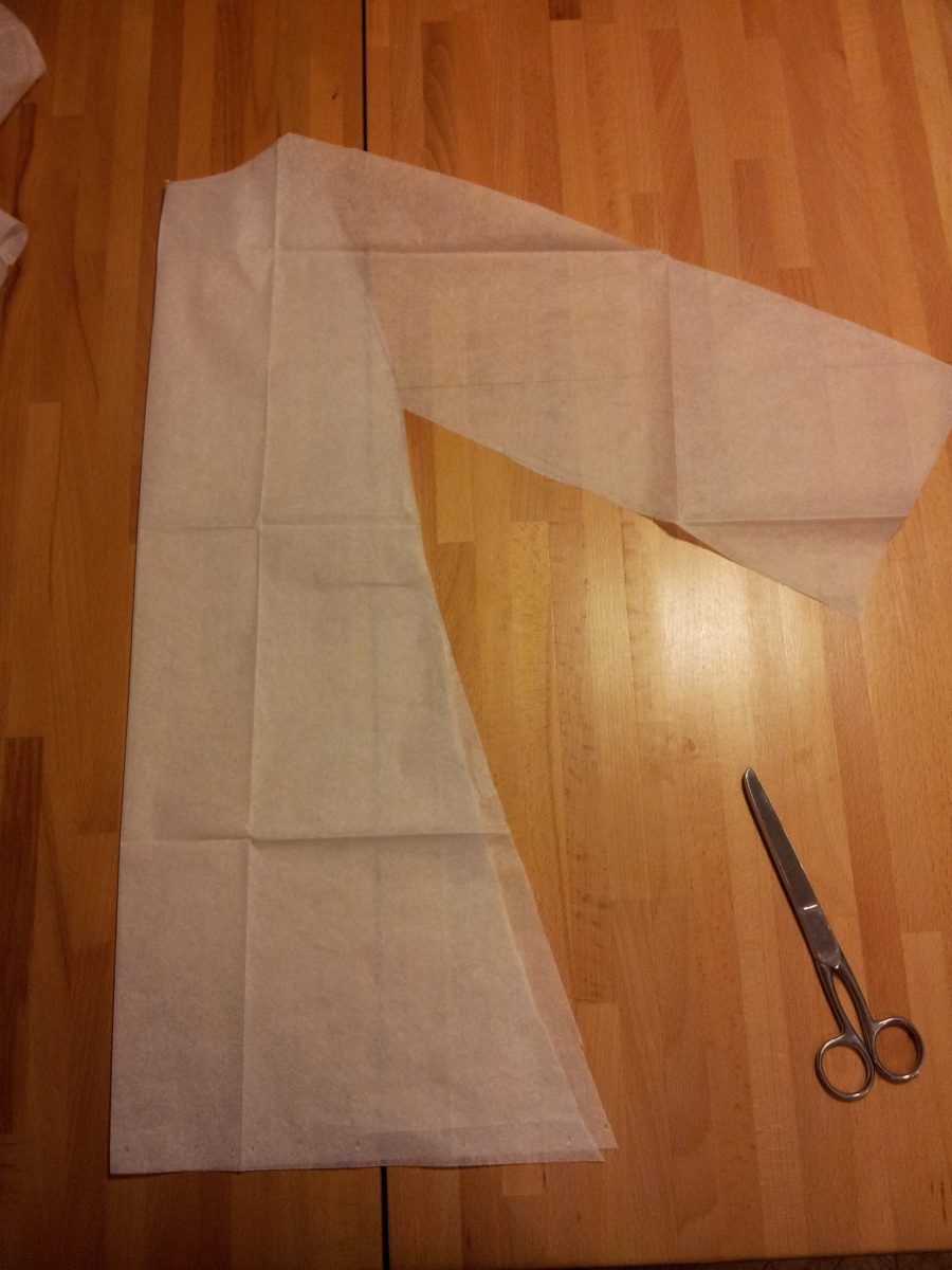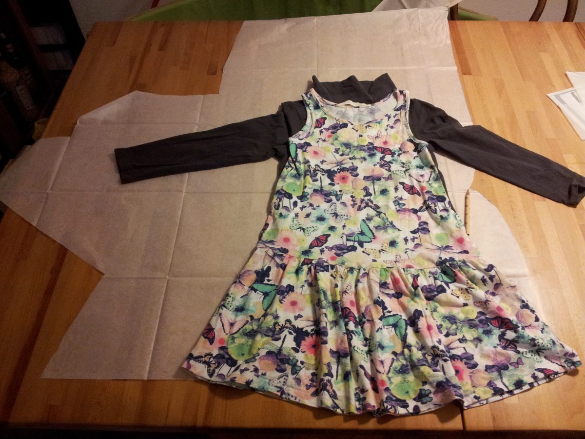 Für die Tunika bin ich vorgegangen wie sonst auch immer: Gerade passende Kleidungsstücke raussuchen und einen ungefähren Schnitt auf Schnittpapier skizzieren. Dabei hab ich die Ärmel weiter gemacht und die Länge gegenüber dem Kleid um ca. 10 cm verkürzt.