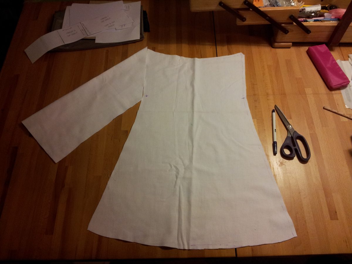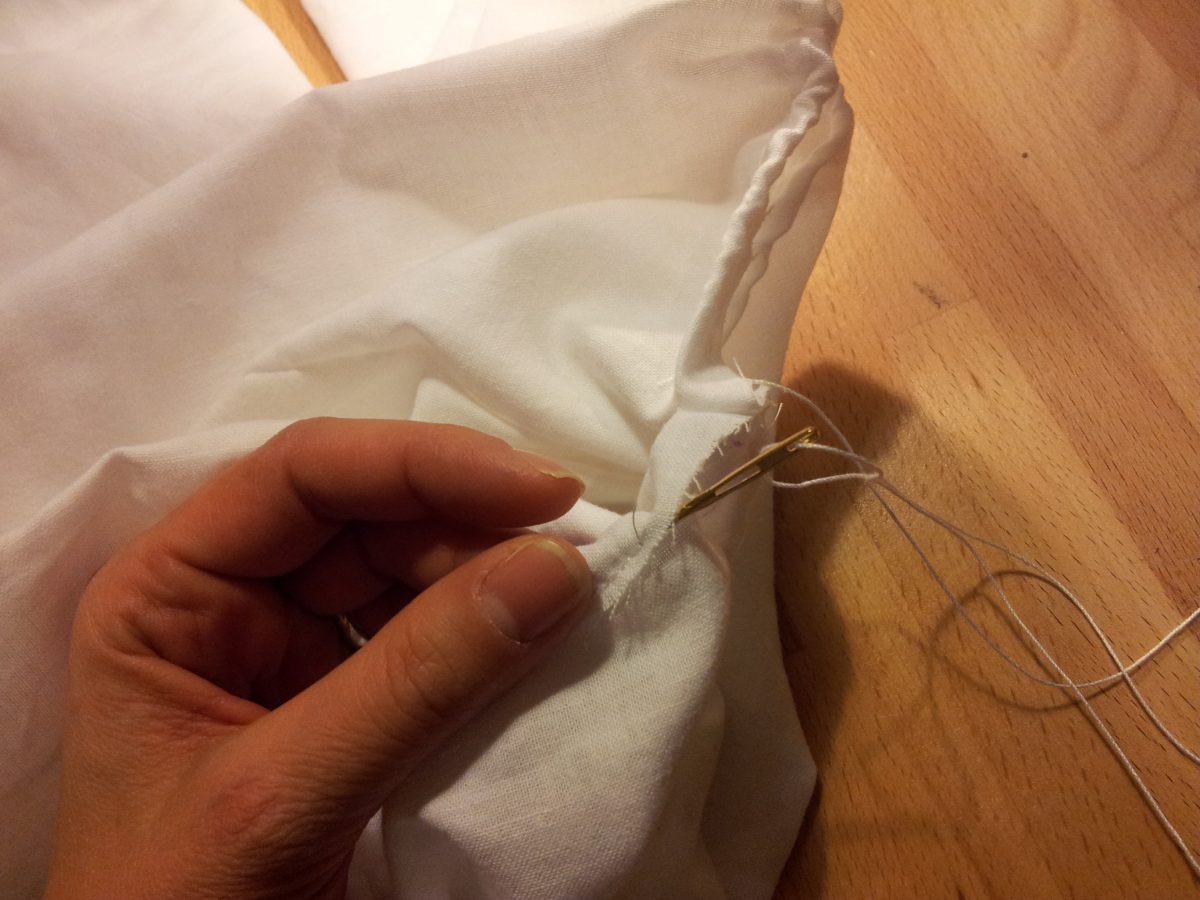 Tunika an den Seiten und an den Schultern zusammengenäht, Ärmel zusammengenäht und rechts auf rechts in die Tunika eingenäht. Den Saum versäubert und dann den Halsausschnitt umgenäht. Bemerkt, dass ich kein dünnes Gummiband mehr zum Einziehen zu Hause habe und improvisiert: Dann nehmen wir halt ein Häkelgarn. Wir raffen damit den Halsausschnitt und verknoten es – für ein Kostüm für einen Tag sollte das reichen.
