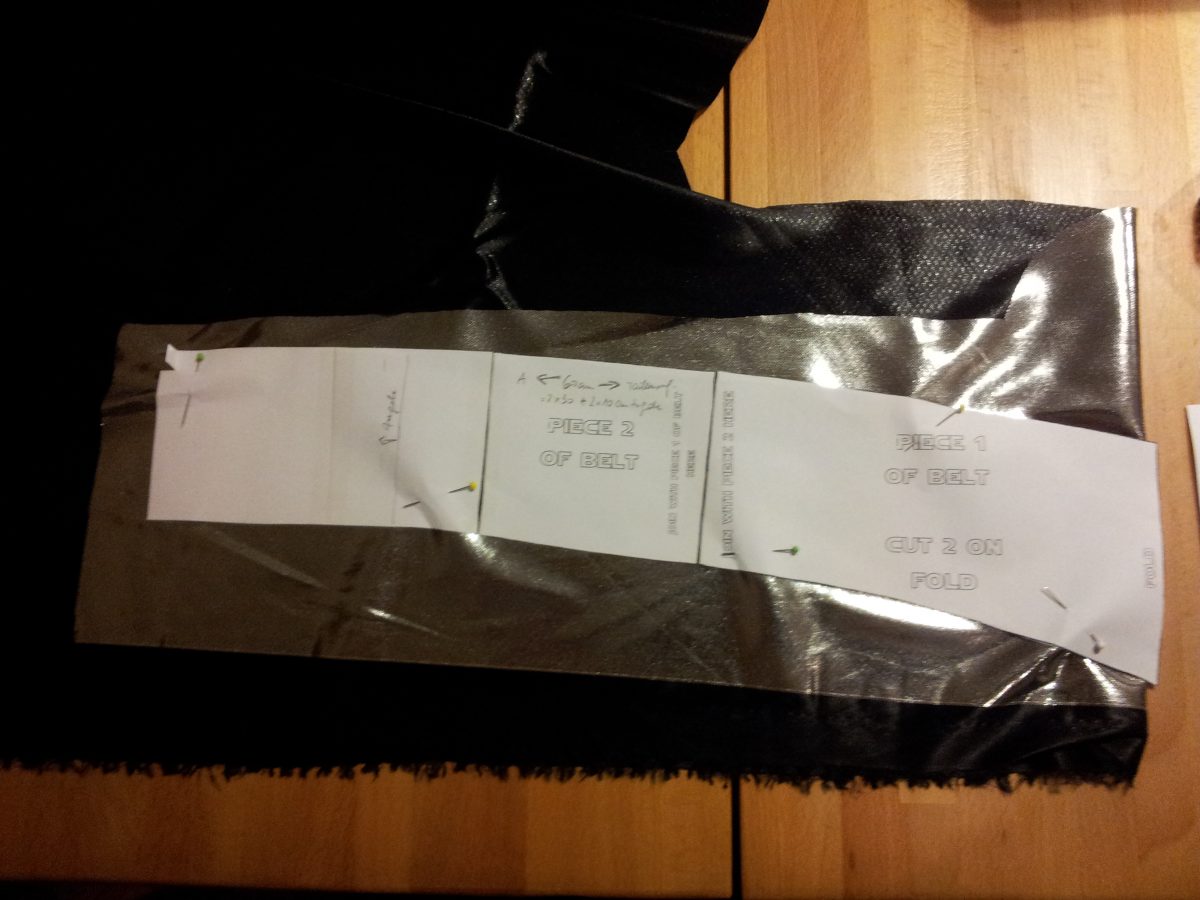 Die Stoffe waren alle vorrätig, bis auf einen Umhang, aus dem leider nichts geworden ist: Wo verflixt noch mal ist diese weiße Fleece-Decke, die ich dafür zerschnippeln wollte? Ich hatte ausgiebig im Internet recherchiert, Vater und Tochter hatten rechtzeitig eine Perücke als Grundlage für die Frisur besorgt, alles wunderbar. Nur dass ich dann von Sonntag bis gestern krankheitsbedingt komplett flachlag, ganz schlimm. Aber versprochen ist versprochen, also hab ich mich gestern Abend noch zur Nähmaschine geschleppt. Daher sind die Fotos alle ein bisschen dunkel. Egal. Es geht mir ja hauptsächlich ums „Wie“. Ich hoffe, das kann man trotzdem erkennen.