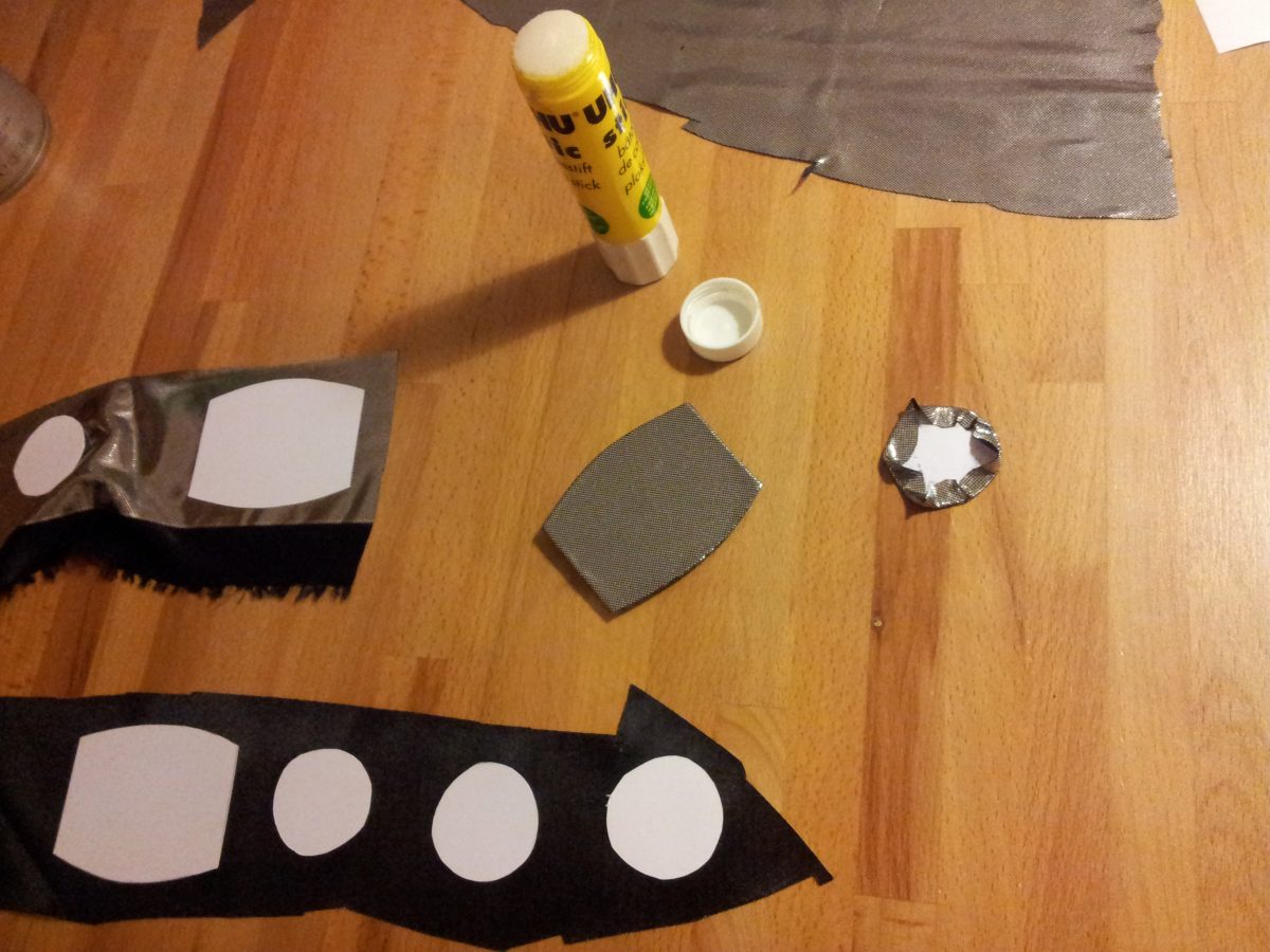 Für den Gürtel habe ich bei craftiness is not optional eine feine, gratis Schnittvorlage gefunden. Der Gürtel wäre der Tochter zu eng geworden, also hab ich ihn verlängert. Und da der Stoff (Rest von einem Ritterkostüm) sehr fein und dünn ist, habe ich ihm zusätzlich eine versteifende Einlage verpasst. Die Teile für die Applikationen hab ich einfach in der benötigten Anzahl aus 160g-Karton ausgeschnitten. (Verzeihung, nicht ich: Da hat der Göttergatte geholfen.) Die Teile mit Klebestift auf der linken Stoffseite fixiert, mit etwas Zugabe ausgeschnitten und die Zugabe umgeklebt.