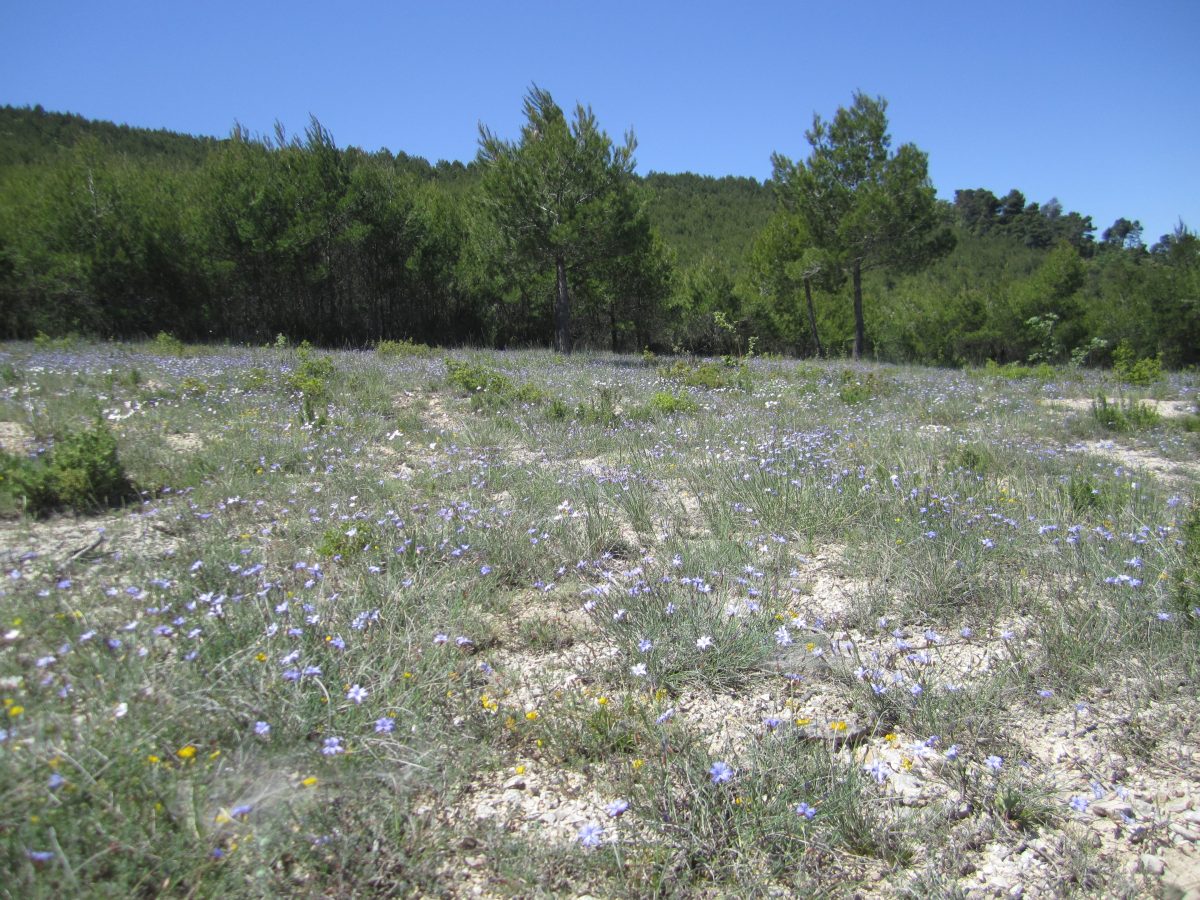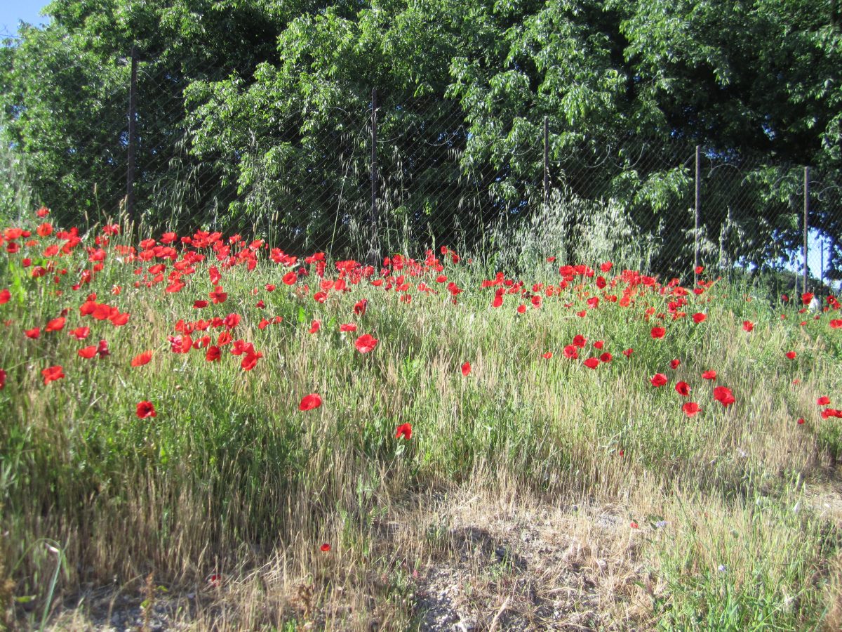 Ich fahre zwischen den Dörfern über verlassene Nebenstraßen durch die karstigen, kalkigen Hügel. Im Schritttempo (was keinen stört, weil keiner unterwegs ist), damit ich mehr schauen kann. Der Klatschmohn (aber noch nicht der Lavendel) blüht überall in den Getreidefeldern und am Straßenrand, und andere Blümchen, schüttere blaue Blumenteppiche, blühen wo nicht so viel Erde ist. Eine karge Landschaft, aber auch sehr grün im Mai. Ich halte bei einem Felsen, fotografiere den Blumenteppich, sitze auf einem Stein und höre dem Wind zu, der durch die Nadelbäume rauscht. Sonst ist es mucksmäuschenstill. In der Viertelstunde, die ich da sitze, kommt kein einziges anderes Auto vorbei.