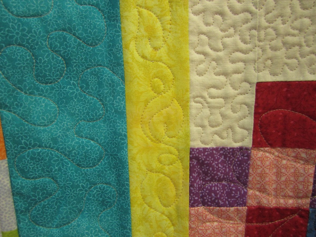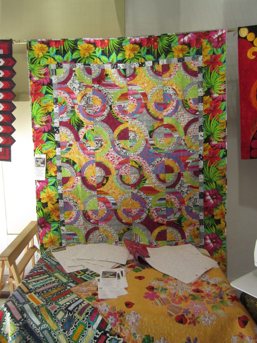 Eine bunte Verkaufsausstellung und ein Weltrekord-Quilt. Die Dame möchte den Quilt mit den meisten einzelnen Stoffstücken (124.800 an der Zahl) erschaffen. Der Quilt ist zumindest groß. Ob auch schön, darüber lässt sich meiner Meinung nach streiten.