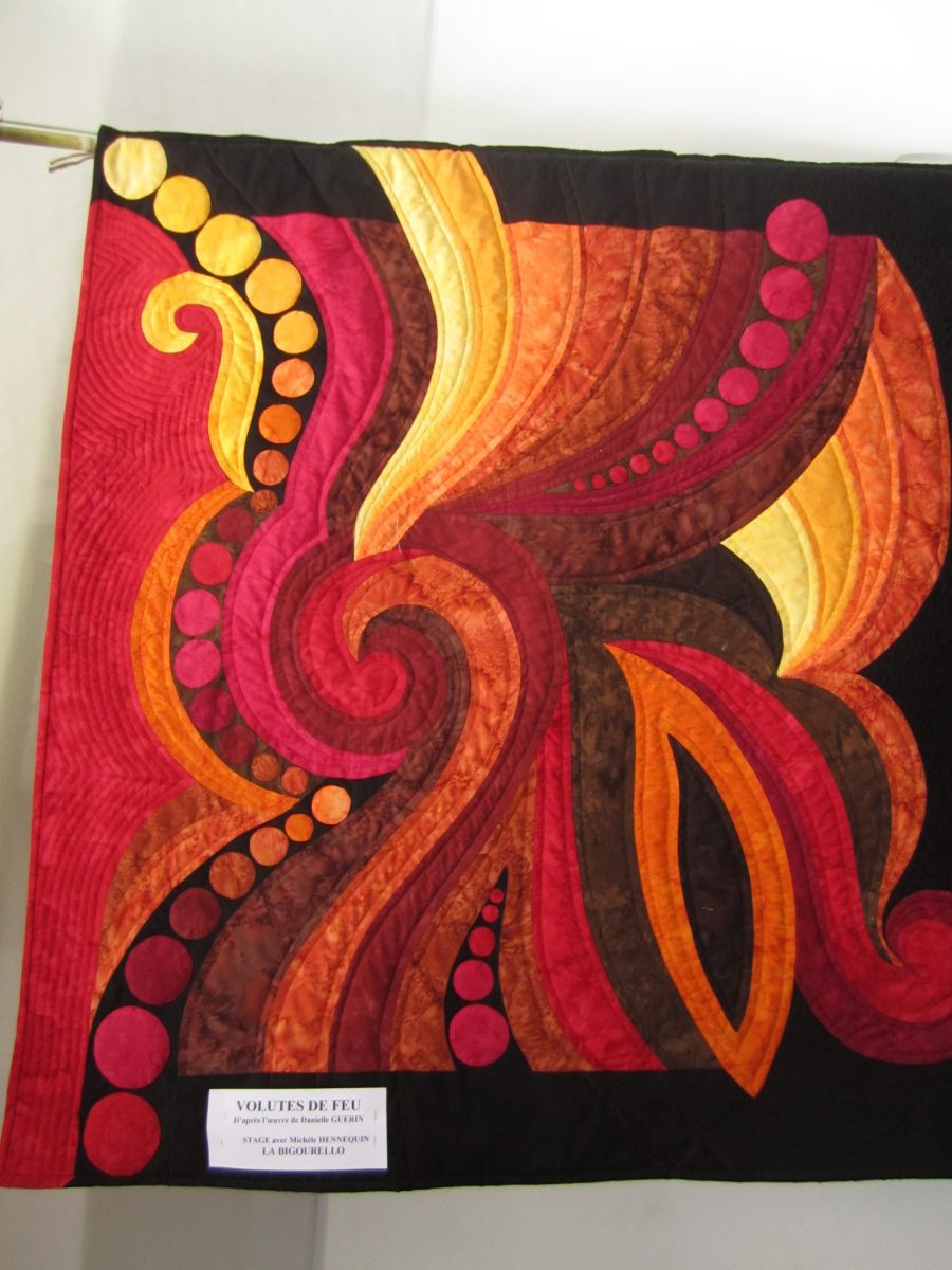 Das Festival Aiguilles en Luberon ist ziemlich umfangreich: Es gab insgesamt 33 Ausstellungen von Künstlerinnen und Künstlern in 13 Orten, hier in der Kirche, da im Gemeindesaal und dort auf einem Landgut. Patchwork und Quilting im klassischen Sinn, aber auch Applikationen, moderne Stickerei, neue Interpretationen von Textilkunst; gestaltet von Hobby-Näherinnen, von Vereinen, aber auch von KünstlerInnen, die damit ihren Lebensunterhalt bestreiten. Ein Wettbewerb (2015 zum Thema „Rouge coquelicot“ – „Mohn-Rot“). Ein Seminarprogramm mit Kursen zum Sticken, Patchwork, Stoffmalerei und Applikation – facettenreiche Textil-Kunst. Das Ganze ergänzt durch zwei Verkaufsausstellungen, bei denen es Näh- und Stickmaschinen zum Ausprobieren gab, sowie Stoffe, Garne, Knöpfe und alles mögliche Näh-Zubehör zu kaufen.