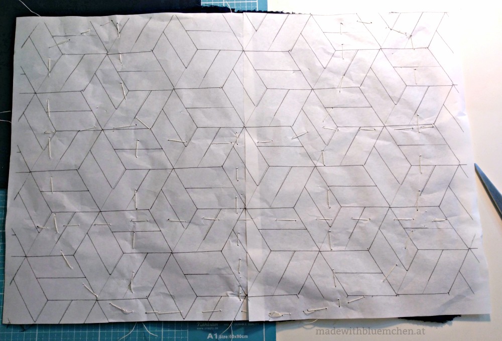 Das Muster habe ich auf „Dünnpost“ ausgedruckt, das ist Papier mit nur 40 g/m2, wie es früher für die Durchschläge bei der Schreibmaschine verwendet wurde. Dieses Papier habe ich auch schon öfter für Foundation Paper Piecing Projekte genutzt: Es hat finde ich genau die richtige Mischung aus „stabil genug zum Durchnähen“ und „leicht rauszureißen“.