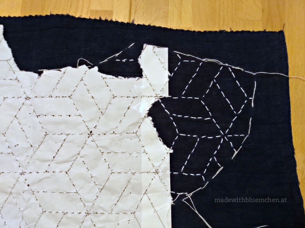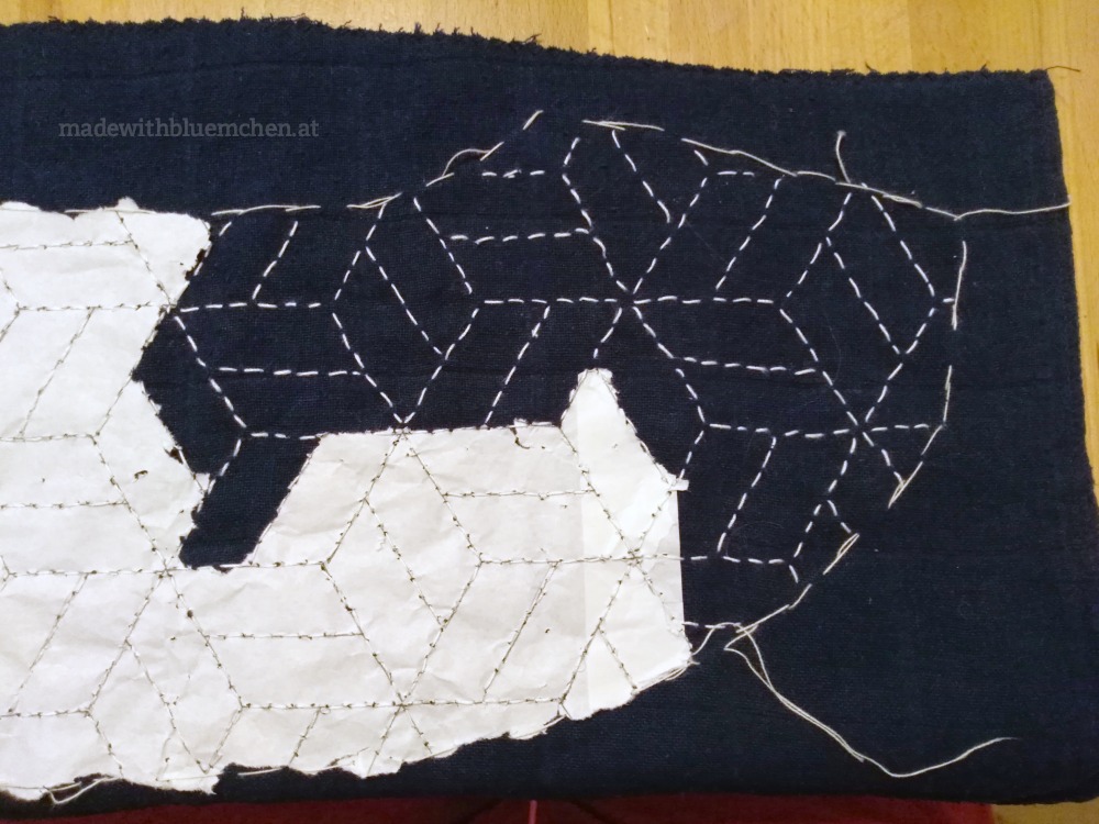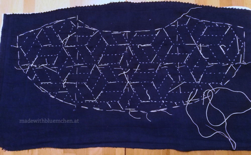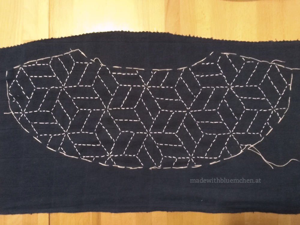 Zwei der Charakteristiken von Sashiko habe ich ganz gut hinbekommen (für meinen ersten Versuch mit dieser japanischen Stickerei): Dass die oben sichtbaren Stiche größer sein sollen als die Stiche auf der Unterseite, und dass Kreuzungspunkte frei bleiben sollen.