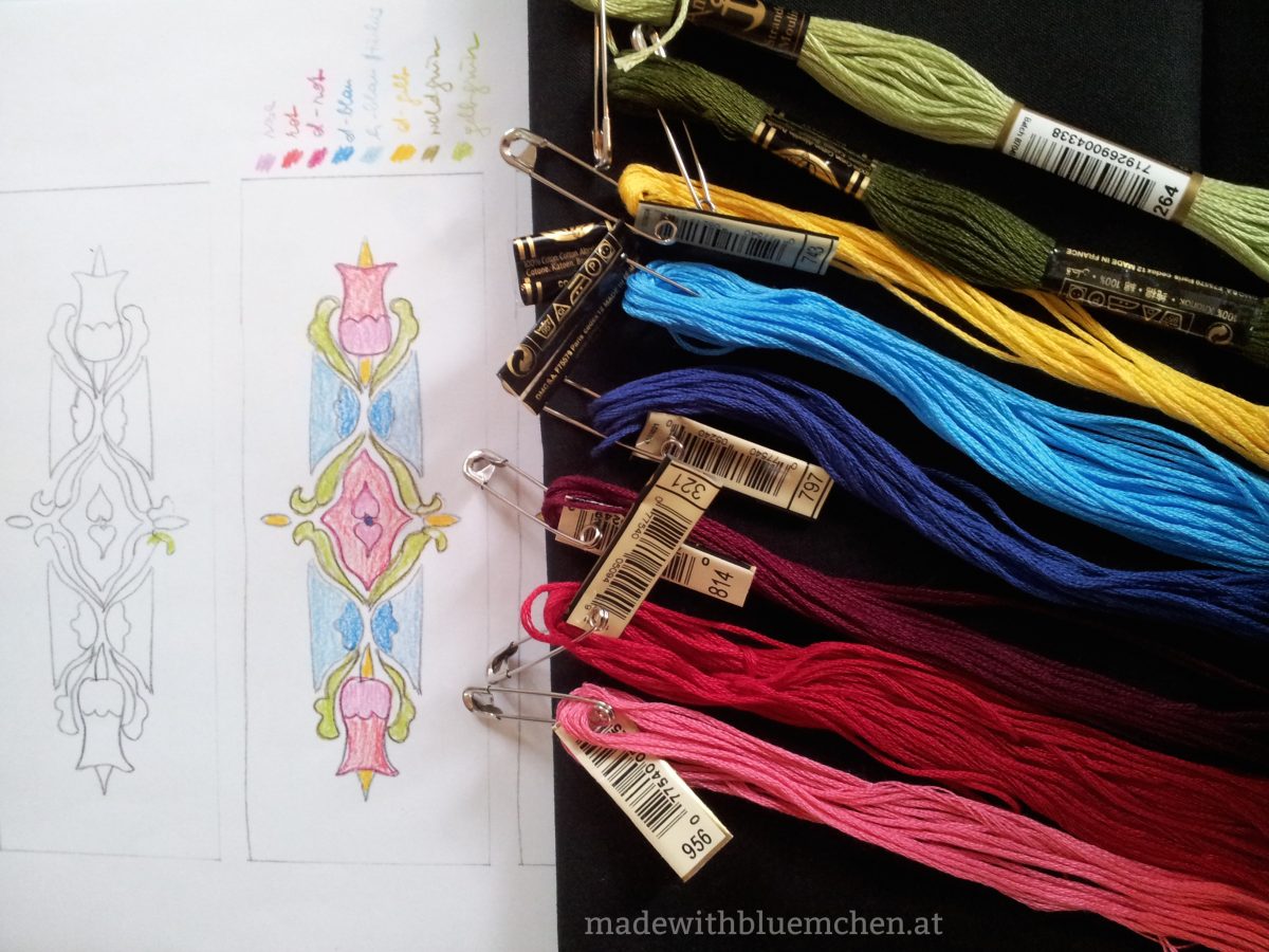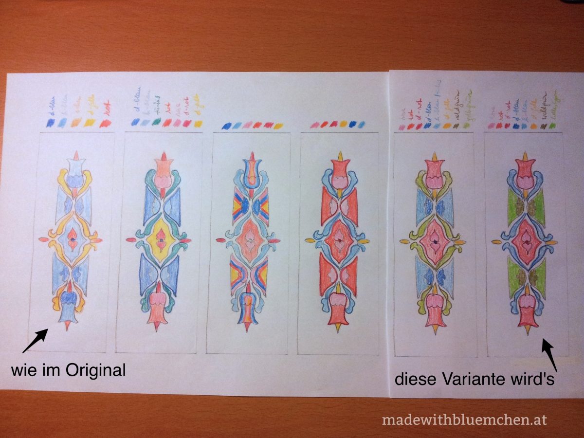Beim Ideensammeln auf Pinterest hat sich eine ganz bestimmte Farbpalette herauskristallisiert: Rosa direkt neben Rot, ein sehr knalliges Hellblau (fast schon Türkis) mit einem dunkleren Mittelblau, und ein Waldgrün mit einem hellen Gelbgrün. Farben, die sich gegenseitig fast „beißen“; Farben, die vor einem dunklen Hintergrund zu leuchten beginnen. Mit diesen „Farben der Folklore“ wollte ich arbeiten.