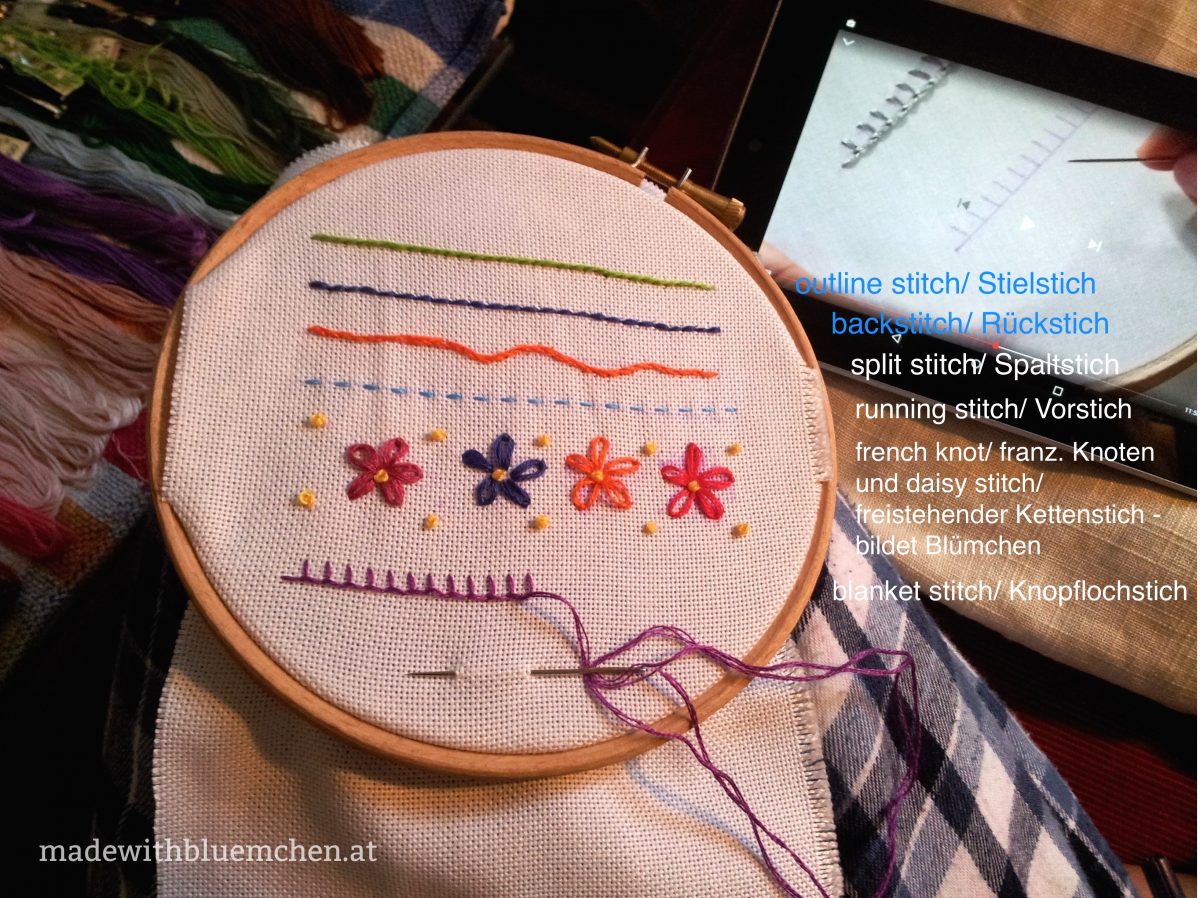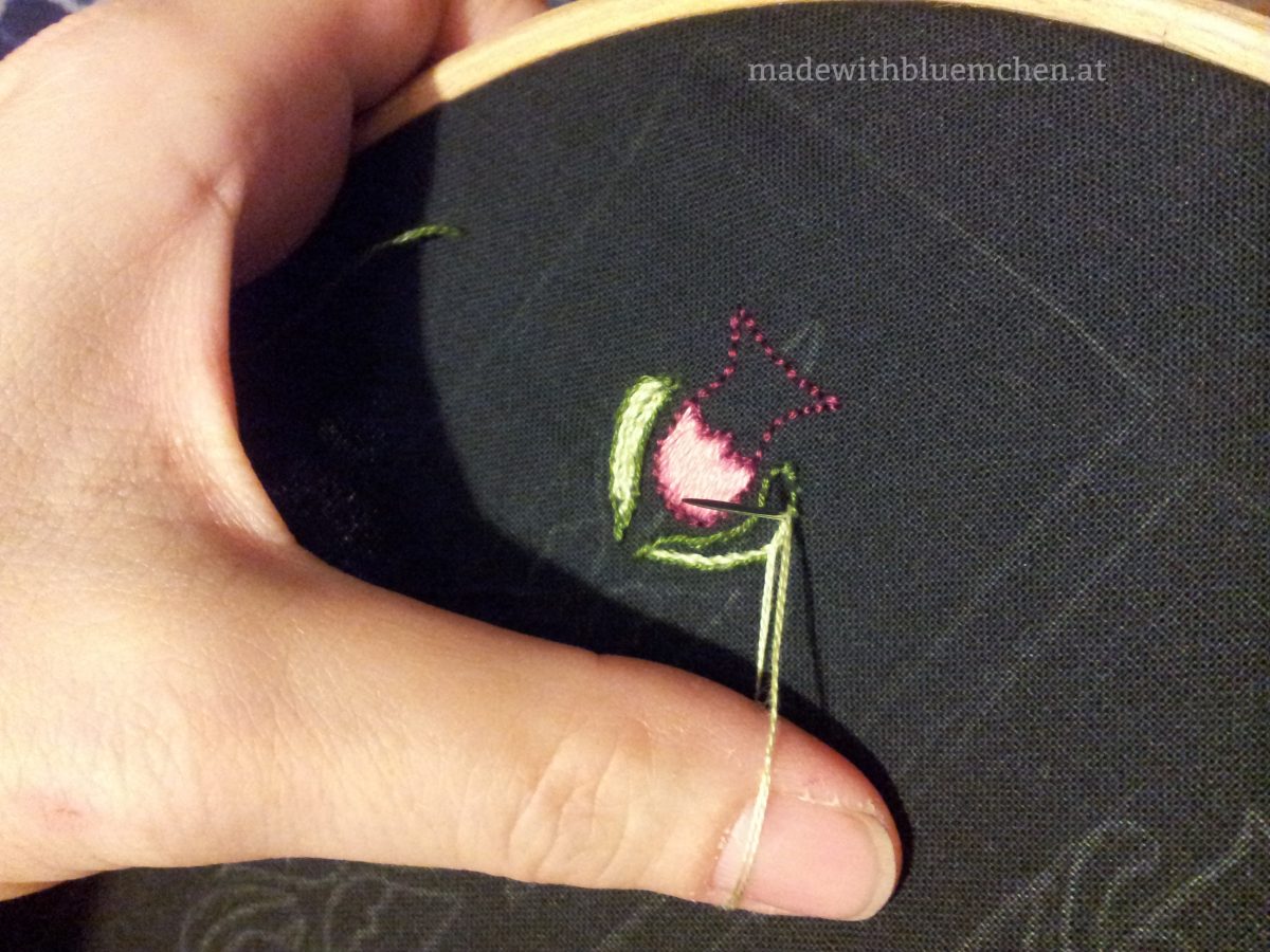 Aber das Üben war wichtig, genauso wichtig wie Vokabel pauken, wenn man eine neue Sprache lernt: Vollblut-Stickerinnen wie Mary Corbet überlegen sich gut, welcher Stich sich am besten für welchen Bereich einer Stickarbeit eignet. Jeder Stich hat seinen eigenen Charakter, ist für andere Zwecke geeignet, und wäre dann auch idealerweise perfekt auszuführen, siehe z.B. 10 Tips for a Sensational Satin Stitch. (Nebenbei: Satin Stitch klingt doch sexier als das deutsche „Plattstich“, oder?) Das ist echt eine eigene Welt, bei der ich gerade mal begonnen habe, an der Oberfläche zu kratzen.