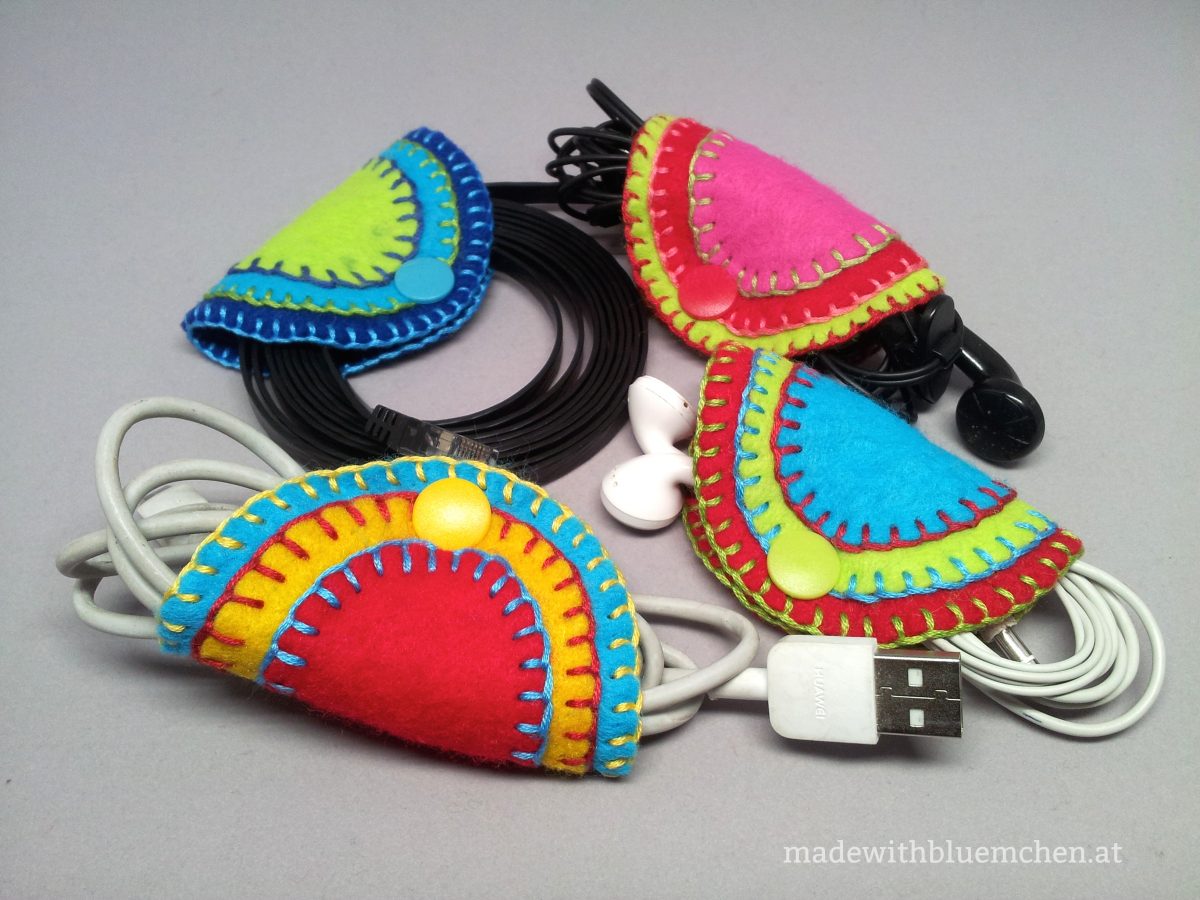 Weil ich aber heute auch etwas Fertiges vorzeigen wollte (wegen des guten Gefühls, das mir etwas Fertiges gibt!), habe ich noch ein lustiges schnelles Projekt eingeschoben: Bei Karin habe ich letztens filzige Kabeltacos gesehen. Die ovale Form ist praktischer als ein bloßer Kreis, und ich habe die Tacos dem Thema gemäß folkloristisch abgewandelt. (Hier gibt’s das Schnittmuster für meine Variante. Ich mag das Fröhlich-Bunte, das diese Kabel-Tacos verbreiten, außerdem sind sie äußerst nützlich.
