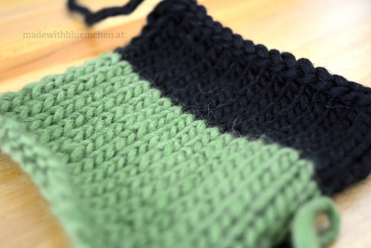 - Taschenbeutel (endgültiges Maß 15 x 20 cm): 42 Maschen auf einem Nadelspiel Nr. 8 angeschlagen, je 16 Reihen in schwarz, grün und limette gestrickt, abgekettet.