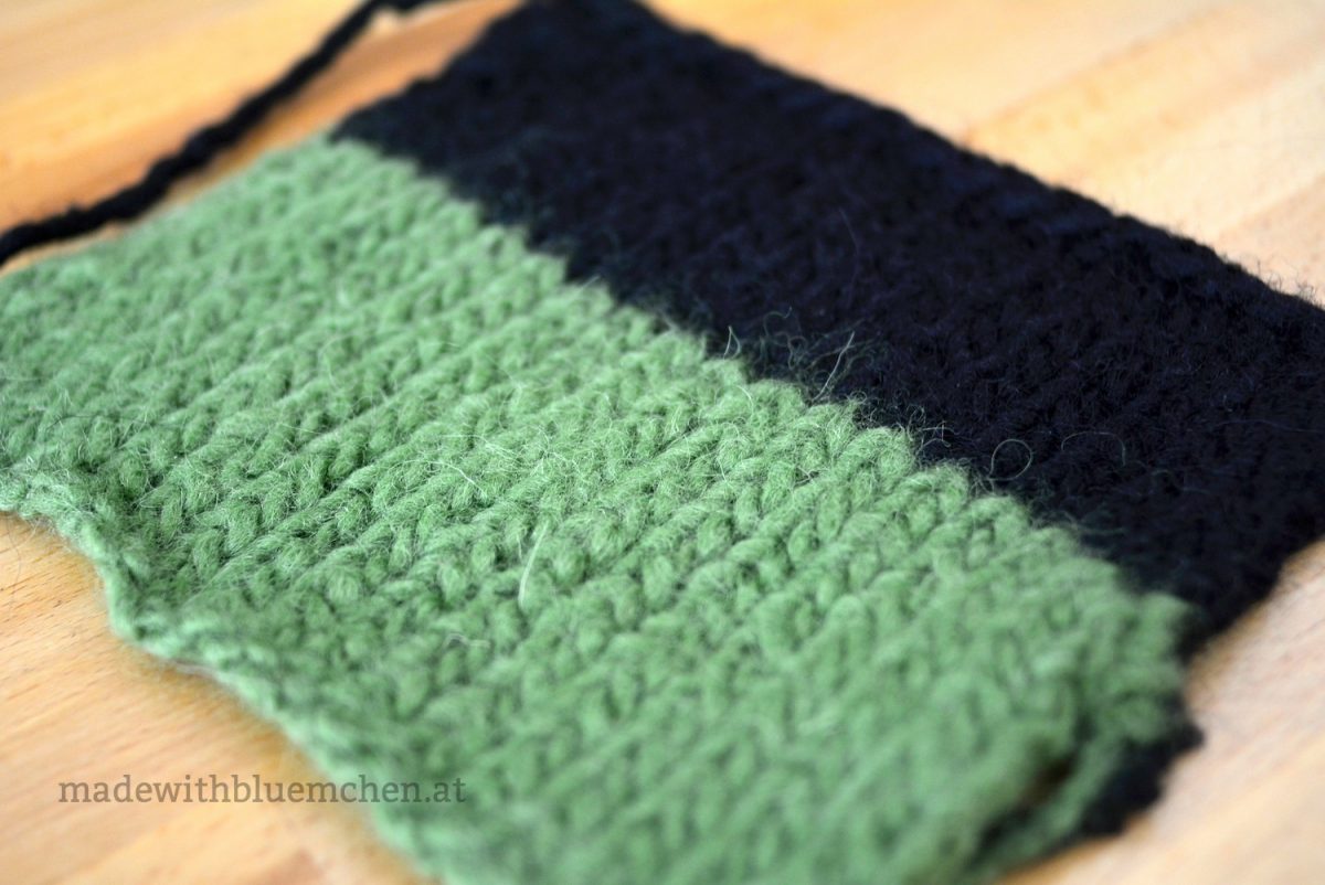Zuerst habe ich die Maschenprobe gestrickt mit Nadeln Nr. 8 wie auf der Banderole angegeben (20 Maschen, 14 Reihen grün plus 10 Reihen schwarz), das ergab 10×10 cm = 12,5 Maschen x 18 Reihen.