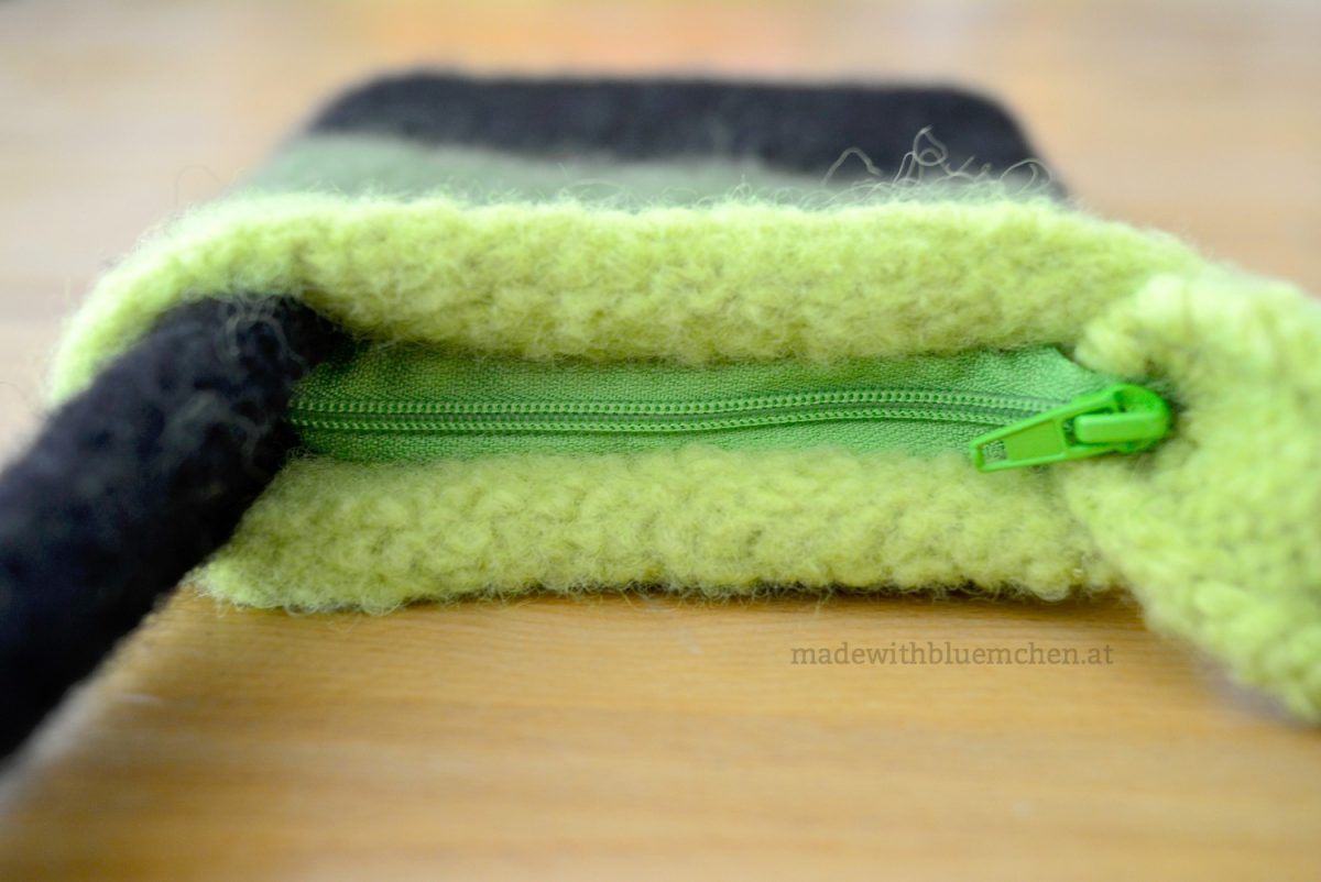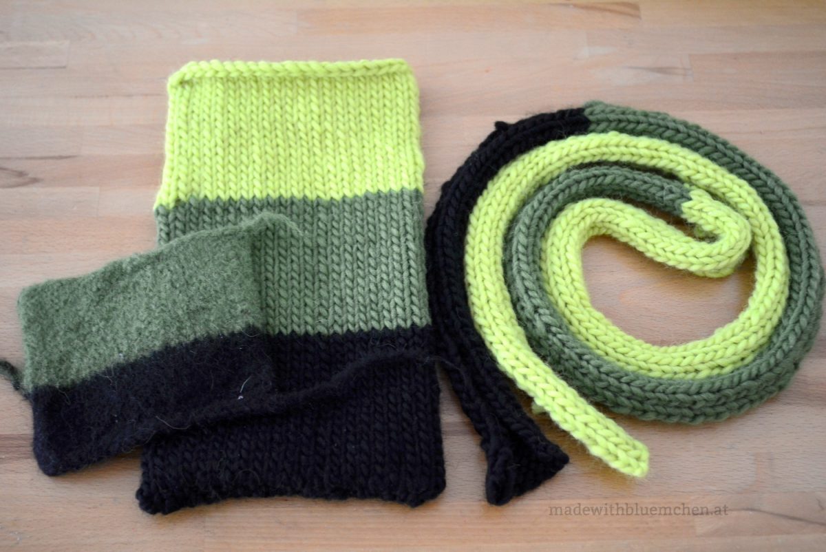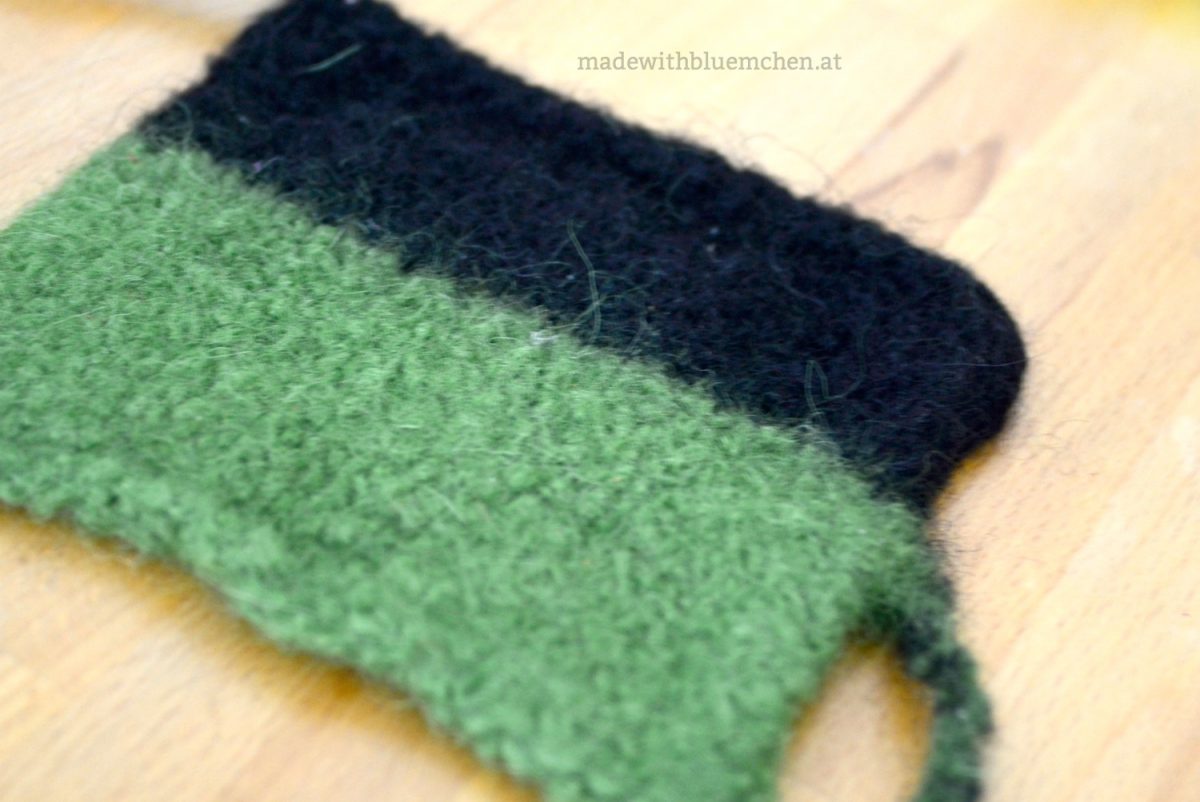 das Filzen habe ich bisher nicht versucht (und hätte wahrscheinlich keine korrekte Maschenprobe gemacht, sondern ein Probestück einfach mal gefilzt). Ich habe mal gefilzte Puschen geschenkt bekommen und nie angezogen. Das lag aber wohl eher an der Form und dass ich keine weichen Schuhe mag. Dein Täschchen passt gut zum Mantel und den anderen grünen Kleidungsstücken – wie gut, dass man durchs Selbermachen Form, Größe und Material selbst bestimmen kann!