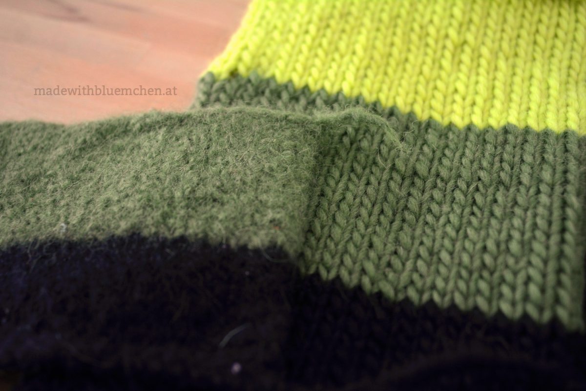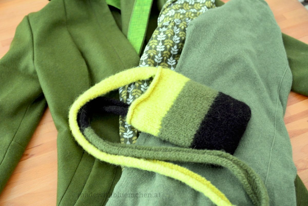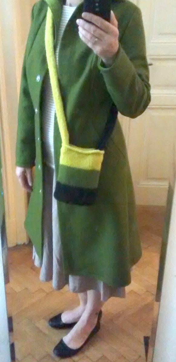 Den Riemen wollte ich eigentlich vollständig limettenfarben haben, aber leider hat die Wolle dafür nicht gereicht und ich musste improvisieren. Die Farben der Tasche passen jedenfalls gut zu meinen grünen Kleidungsstücken, und das Gefilzte besonders zum grünen Loden des Stadtmantels.