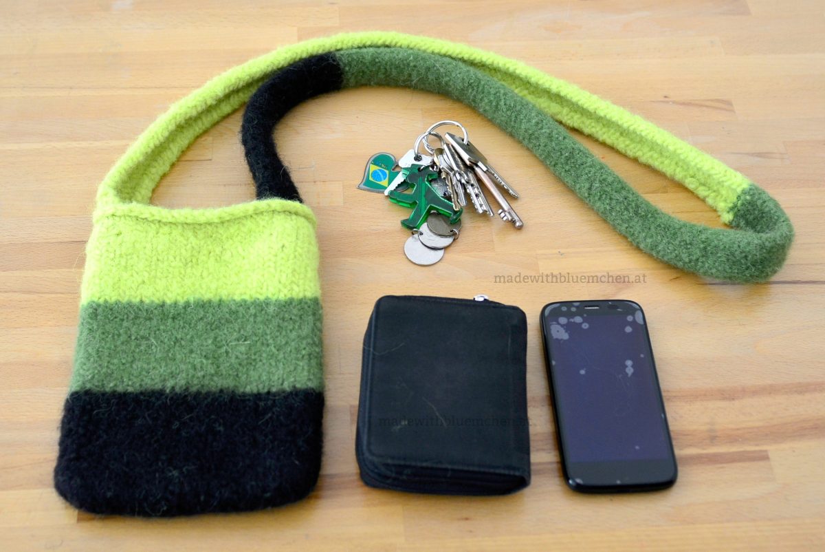 Aus einer Schafwolle, die extra zum Verfilzen in der Waschmaschine gedacht ist, habe ich ein kleines Täschchen für die lebensnotwendigen Dinge unterwegs – Schlüssel, Handy und Geld – gestrickt. Und mir dabei nicht nur den Sinn von Maschenproben fern-erklären lassen, sondern sogar erfolgreich umgesetzt.