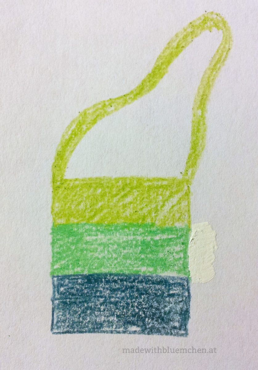 Manche Projekte brauchen ihre Zeit. Im Frühjahr 2015 sah ich, mit dem Rad unterwegs, im Vorbeifahren eine Tasche, die mir sehr gefiel. Wieder zu Hause fertigte ich eine Skizze davon an. Die Tasche in drei verschiedene Grüntönen war offensichtlich zuerst gestrickt und dann gefilzt worden. Im Frühjahr 2016 entdeckte ich, dass es spezielle Filzwollen gibt und kaufte drei halbwegs passende Farben für die Tasche. Und jetzt, im Mai 2017, habe ich das Motto „Liebling, ich habe die Tasche geschrumpft“ bei Greenfietsens Taschen Sew-along genutzt, um die Wolle endlich zu verarbeiten. Und die Tasche anschließend zu schrumpfen.