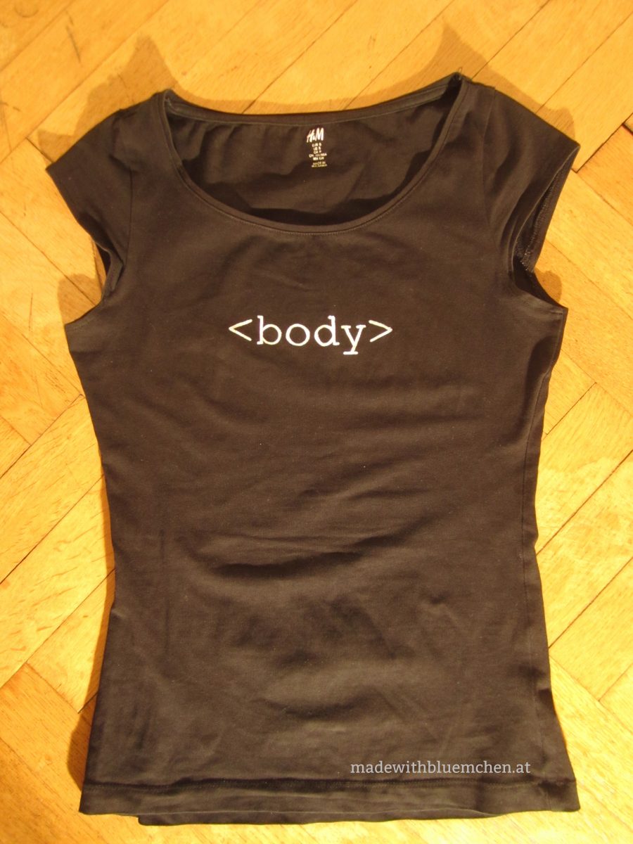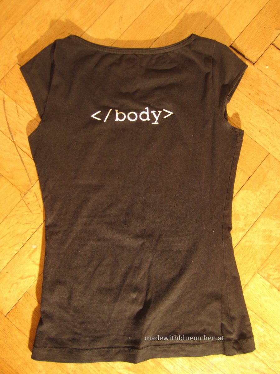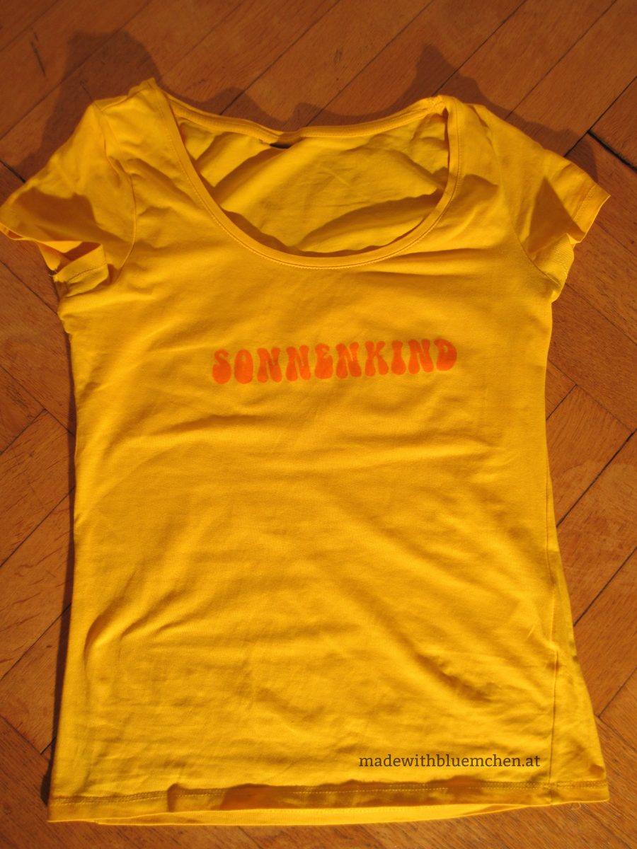 Ich versuche am Computer Motiv und Schrift in eine Form und Größe zu bringen, die später gut am Shirt aussieht. Das braucht normalerweise ein paar Iterationen von Ausdrucken, Auflegen aufs T-Shirt, nicht zufrieden Sein, Verändern, Ausdrucken, Ausprobieren… Wenn alles passt, drucke ich das Motiv auf etwas dickerem Papier/ feinem Karton (120 Gramm) aus.
