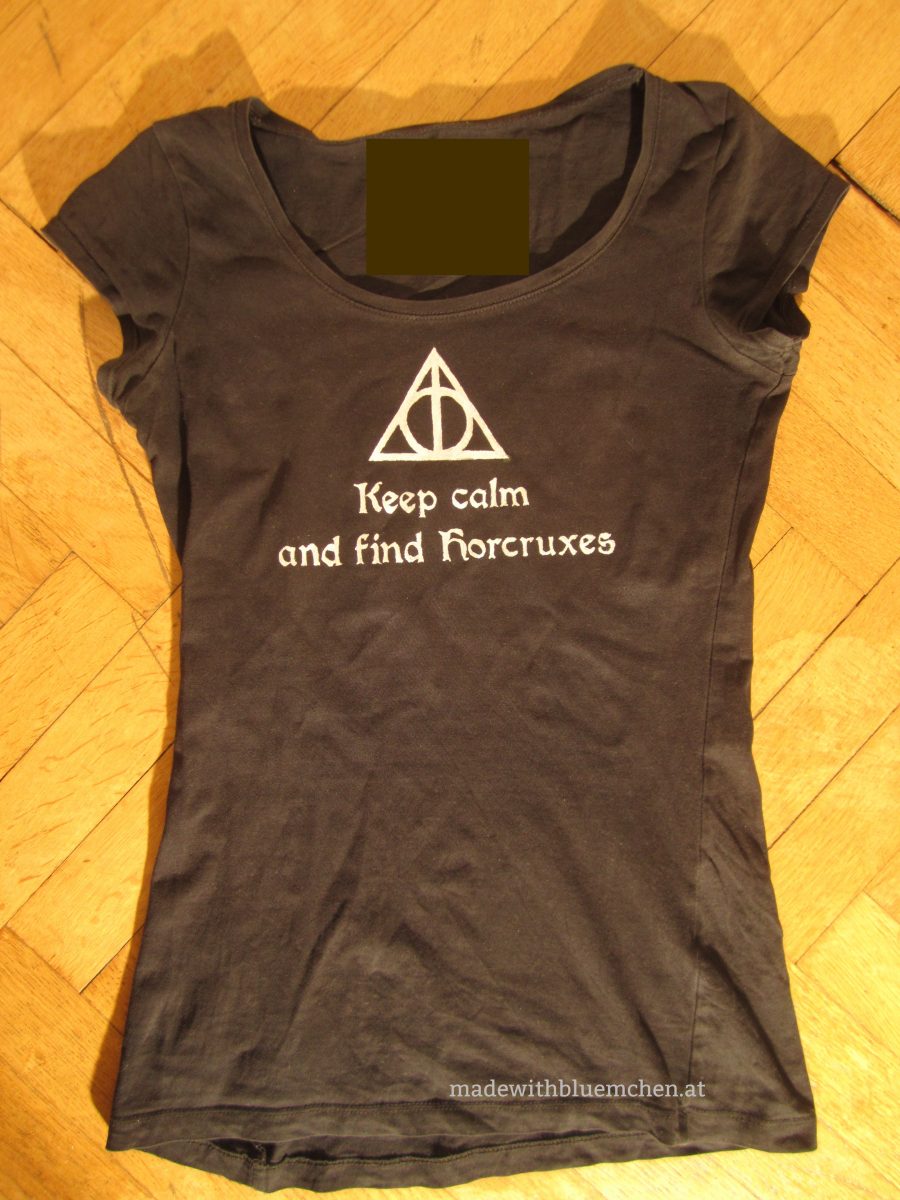 Hin und wieder muss ein T-Shirt bemalt werden. Es ist meist ein Spruch oder eine Aussage, die mich anspringt und bettelt: „Bitte transferiere mich! Es muss mich jemand tragen!“ Wie beim aktuellen Motiv, das mir bei lottapeppermints „Nerd ’n‘ Geek Linkparty“ ins Auge gesprungen ist, wo es als Bild einen schönen Rahmen ziert. (Alles klar? Das Motiv symbolisiert die drei „Heiligtümer des Todes“ aus dem gleichnamigen Harry-Potter-Band.)