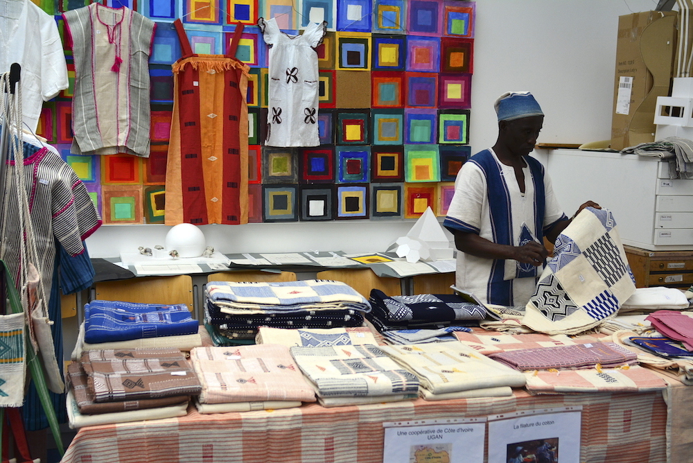 Traditionell werden in Côte d’Ivoire schmale Bänder gewebt und erst anschließend zu Decken, Tüchern und Kleidung zusammengenäht. Die Kettfäden werden dabei nicht mittels (oh nein, mir fehlt das Web-Vokabular!) so Schäften (?) hochgezogen zum Muster einweben, sondern die Kettfäden werden für jede Musterreihe mit der Hand abgezählt. (Bitte verzeiht, besser kann ich das nicht beschreiben.) Man konnte dort das Weben ausprobieren und auch fertig gewebte Stücke kaufen.