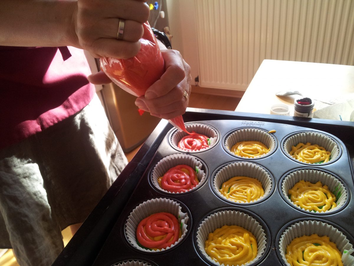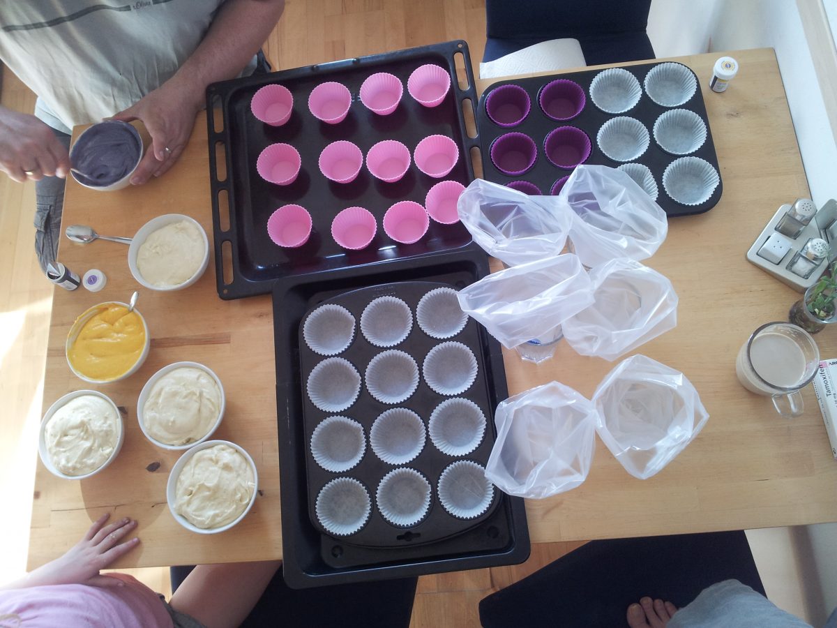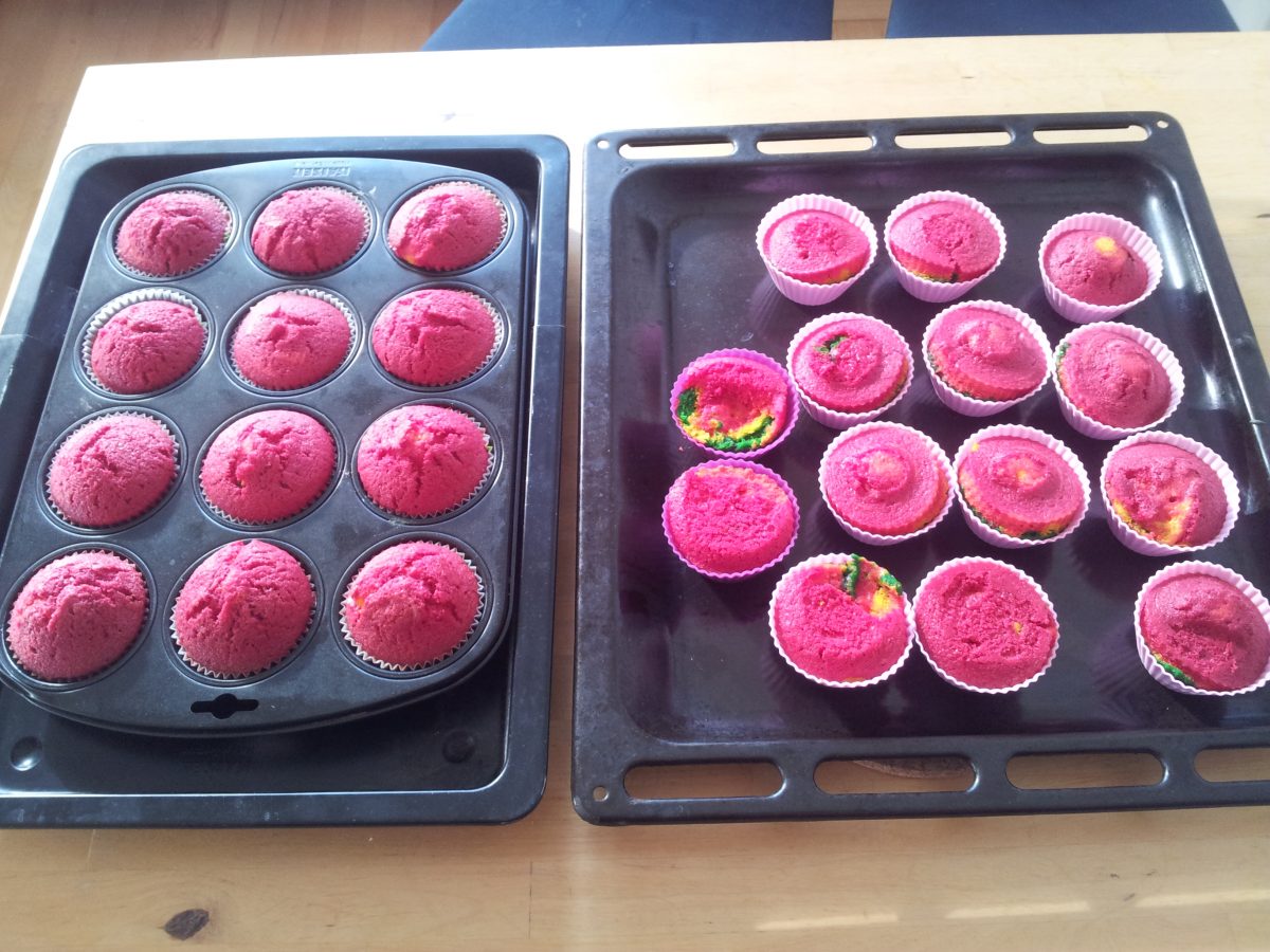 Der Teig vom Originalrezept ist ziemlich klebrig. Wir haben etwas mehr Milch genommen, sodass der Teig gerade dickflüssig genug wird, dass man ihn mit einem Spritzbeutel in die Muffins-Förmchen spritzen kann. Das hat wunderbar funktioniert. Die knalligen Farben des fertigen Backwerks faszinieren mich schon sehr. Jeden Tag mag ich das sicher nicht essen, aber so für ab und zu sind diese Muffins ein echter Hingucker.