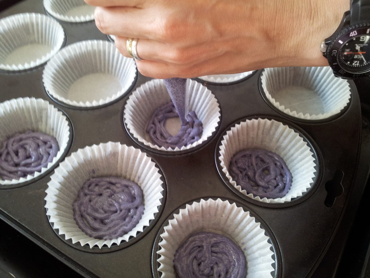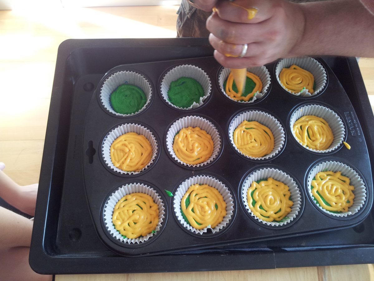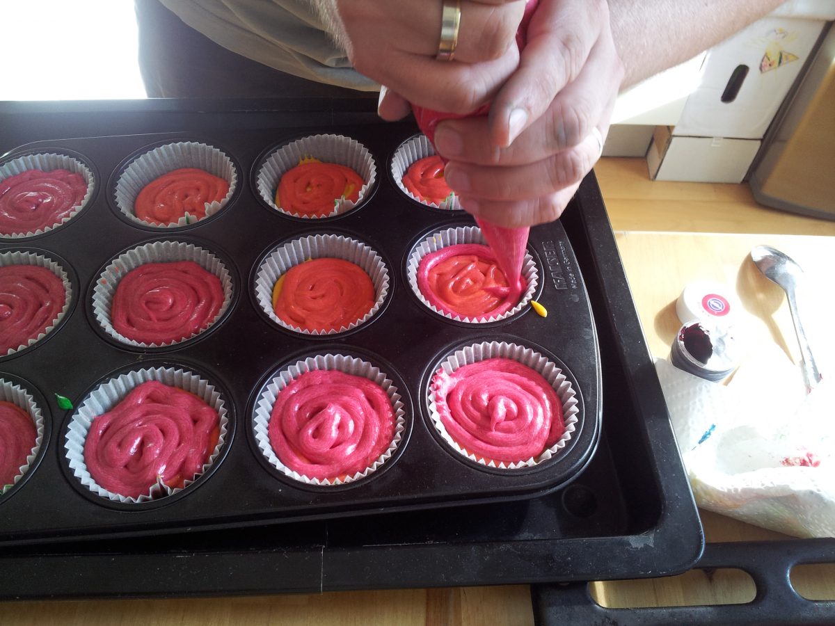 Der Teig vom Originalrezept ist ziemlich klebrig. Wir haben etwas mehr Milch genommen, sodass der Teig gerade dickflüssig genug wird, dass man ihn mit einem Spritzbeutel in die Muffins-Förmchen spritzen kann. Das hat wunderbar funktioniert. Die knalligen Farben des fertigen Backwerks faszinieren mich schon sehr. Jeden Tag mag ich das sicher nicht essen, aber so für ab und zu sind diese Muffins ein echter Hingucker.