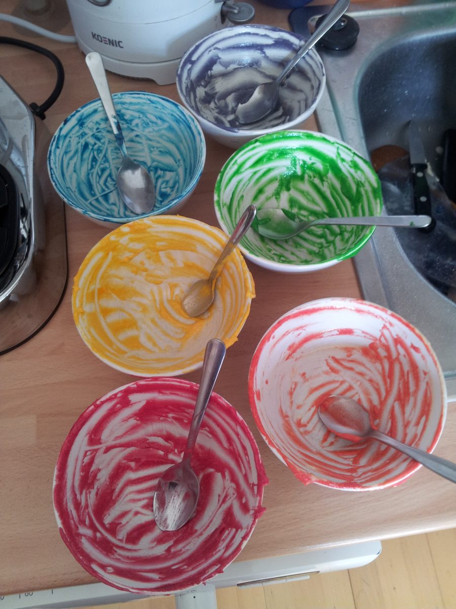 Man braucht nur gaaanz wenig von der Farbe. Anfangs wirken die Farben noch gedämpft. Beim Backen werden sie knallig.