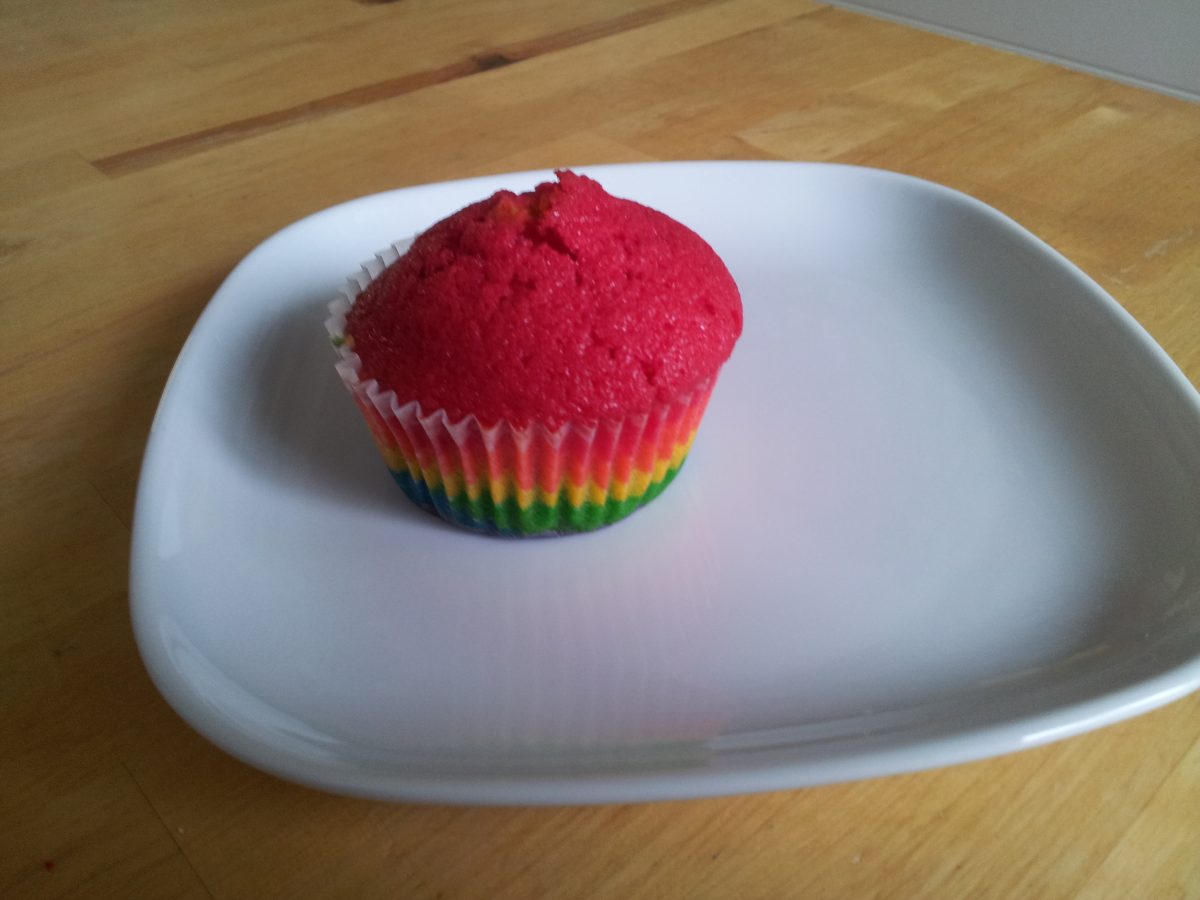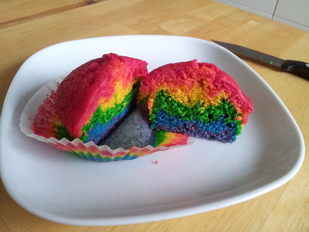 Letztens, bei der Torte mit der Maus, habe ich Euch ja angekündigt, dass wir mit der Lebensmittelfarben-Paste auch noch etwas Buntes backen würden. Regenbogenmuffins haben wir uns ausgesucht.