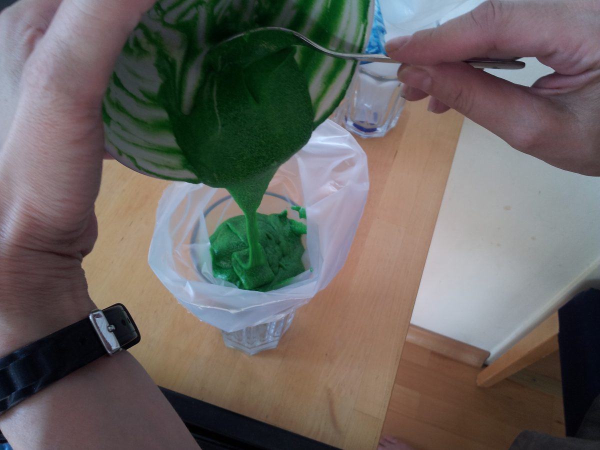 Die Farben einzeln in die Teigportionen rühren und die Teigportionen in die Spritzsäcke füllen.